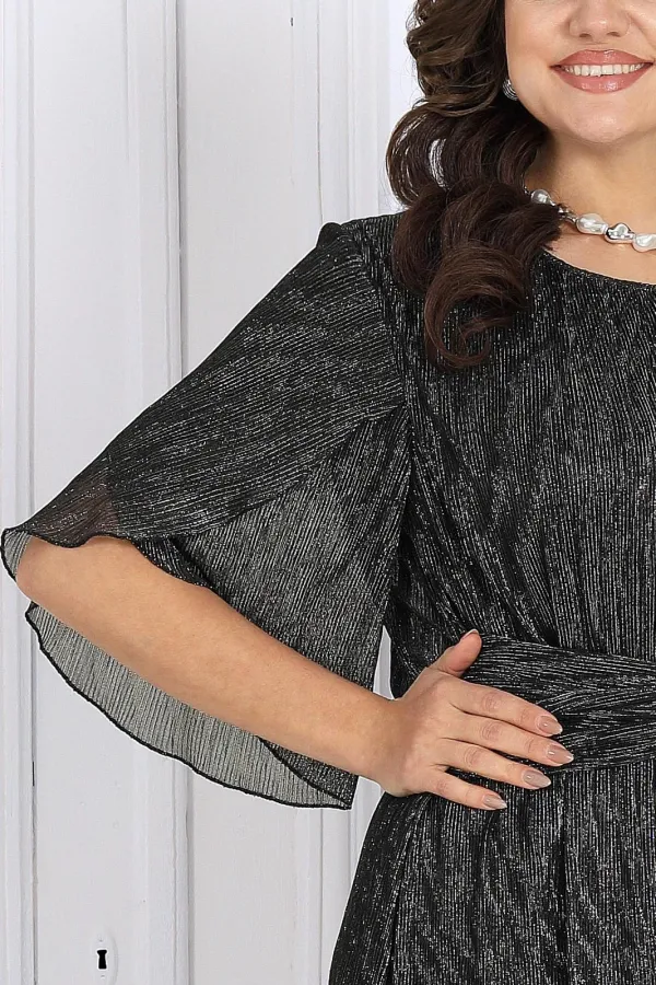 Блузка выполнена из изысканной сетки-гофре с люрексом, которая мягко переливается при каждом движении, создавая благородное сияние. Внутренняя трикотажная подкладка обеспечивает комфорт и делает посадку идеальной даже для полных женщин. Фигурный крой и драпированный пояс с перекрутом формируют женственный силуэт — акцентируют талию, визуально вытягивая фигуру и делая её стройнее. Рукава особого фасона с разрезом добавляют легкости и движения образу, придавая наряду современное звучание и ощущение воздушности.
