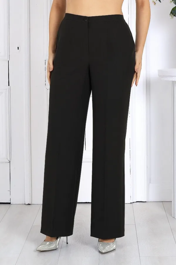 Брюки из костюмной ткани идеально дополняют верх, создавая лаконичную вертикаль, которая делает образ ещё более пропорциональным.