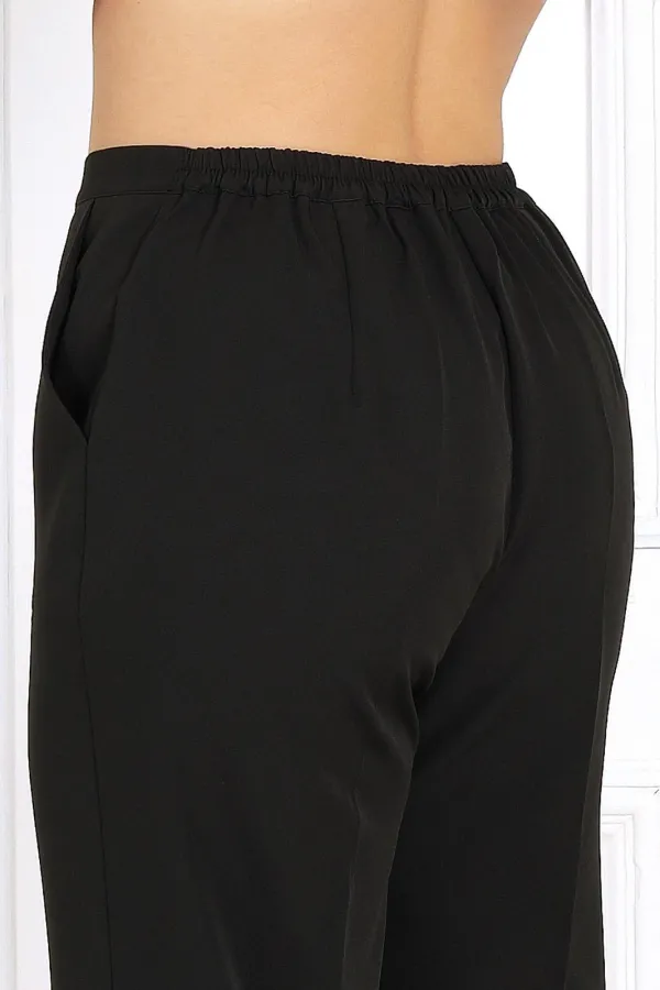 Брюки классические, длинные, с посадкой на талии, выполнены из костюмно- плательной ткани. Модель со стрелками. Передние и задние половинки брюк с талиевыми вытачками, направленными от пояса вниз. Спереди обработаны наклонные боковые карманы и центральная застёжка на тесьму-«молнию». Притачной пояс застегивается на 1 петлю и 1 пуговицу; для лучшего прилегания по линии талии в притачном поясе предусмотрена эластичная лента, вставленная по спинке. Длина брюк по боковому (с поясом) – 107 см (50-52 р-р), 108 см (54-58 р-р).