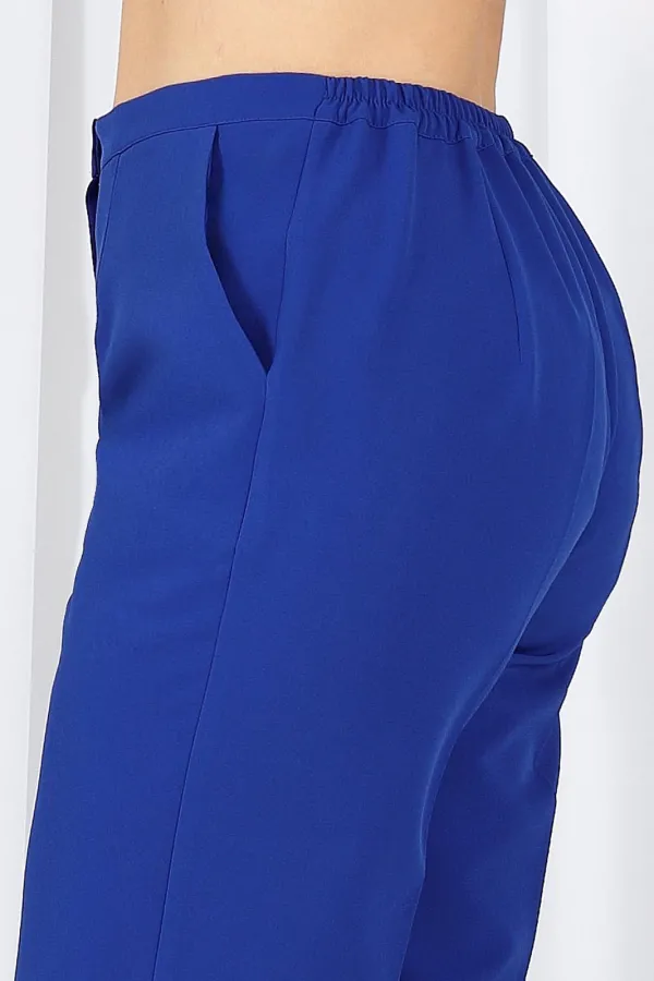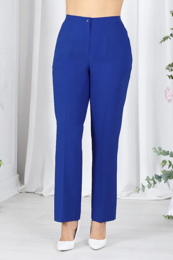 Брюки классические, длинные, с посадкой на талии, выполнены из костюмно- плательной ткани. Модель со стрелками. Передние и задние половинки брюк с талиевыми вытачками, направленными от пояса вниз. Спереди обработаны наклонные боковые карманы и центральная застёжка на тесьму-«молнию». Притачной пояс застегивается на 1 петлю и 1 пуговицу; для лучшего прилегания по линии талии в притачном поясе предусмотрена эластичная лента, вставленная по спинке. Длина брюк по боковому (с поясом) р.50-52 -103 – см; р.54-58 -31,5 см.