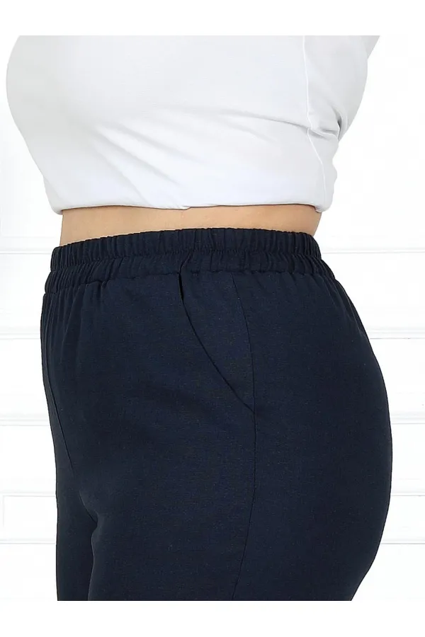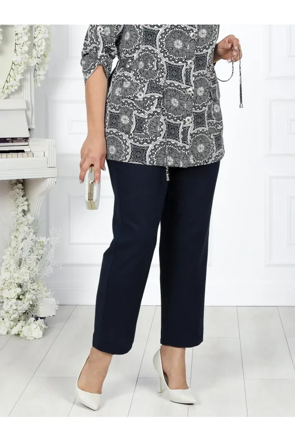 Брюки с посадкой на талии, зауженные к низу, на притачном поясе с резинкой вдоль всего пояса, длиной по боковому шву 102 см с учетом пояса. На передних половинках брюк расположены наклонные боковые карманы.
