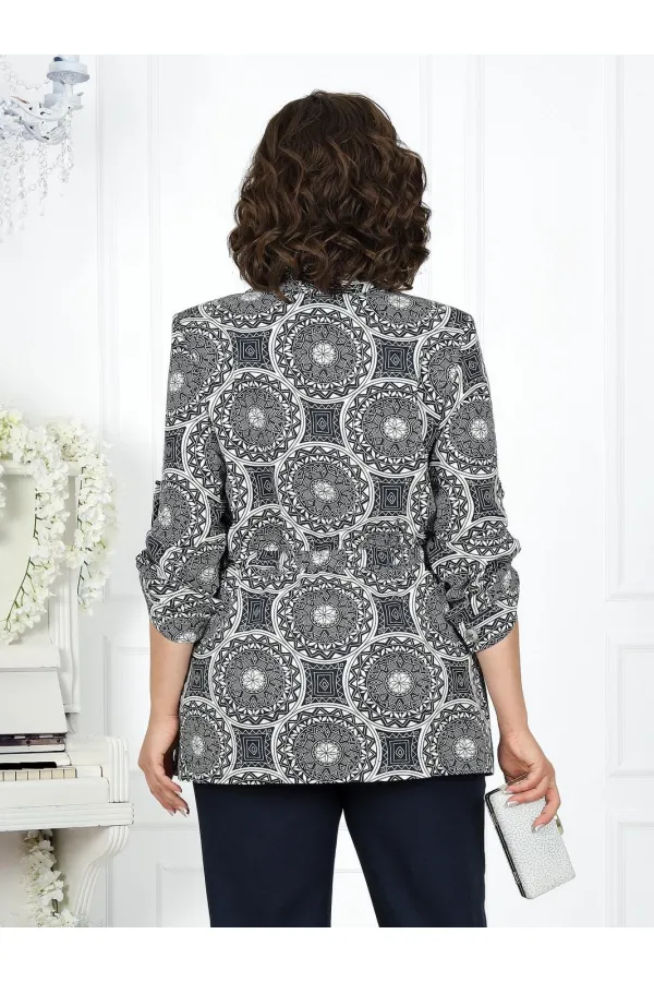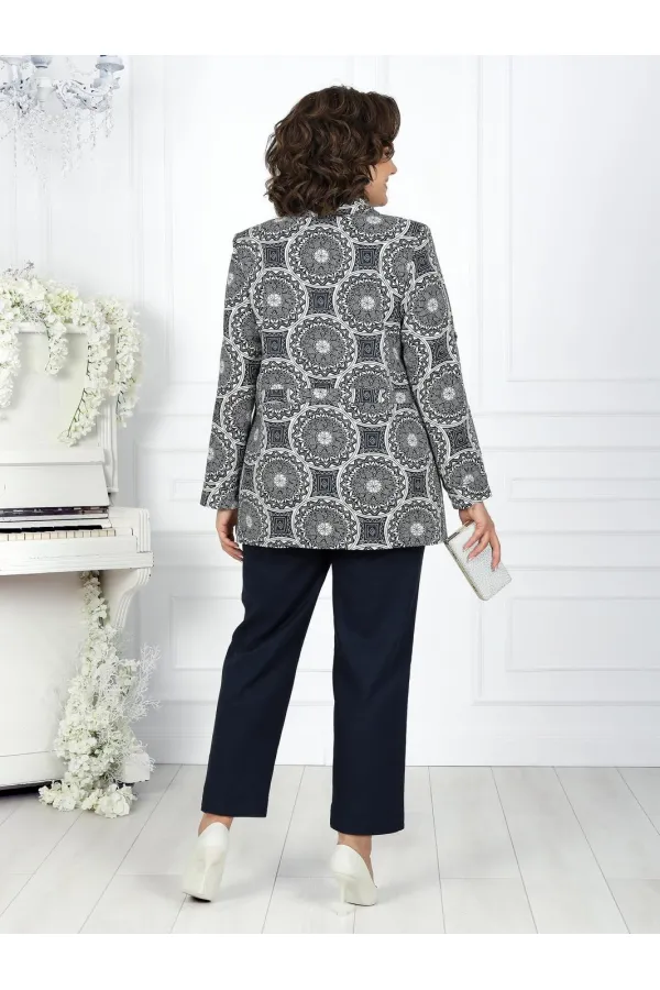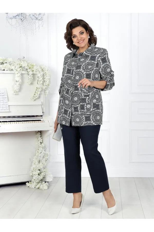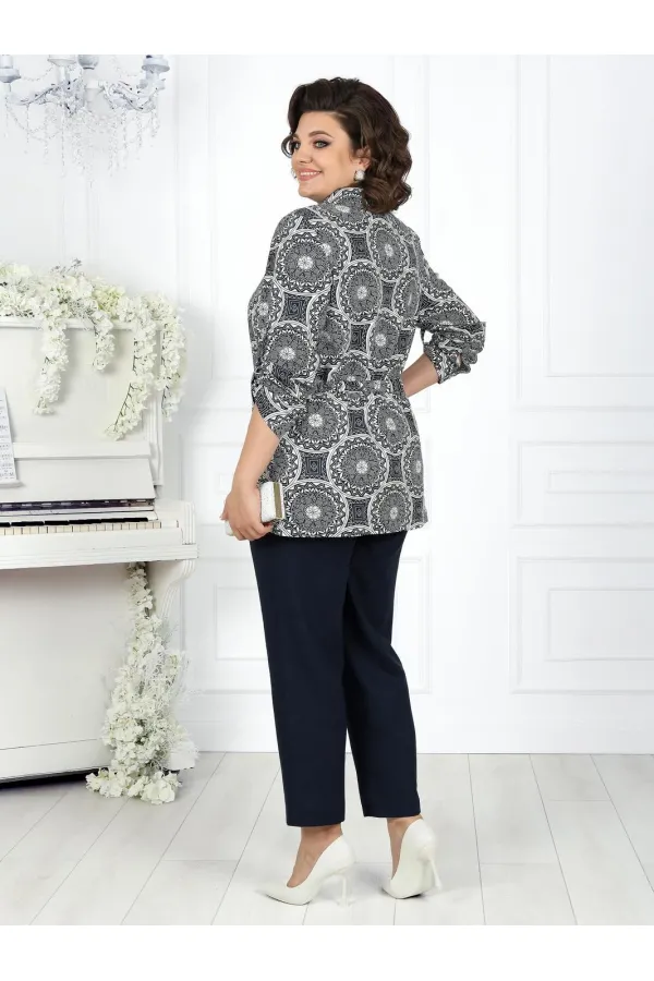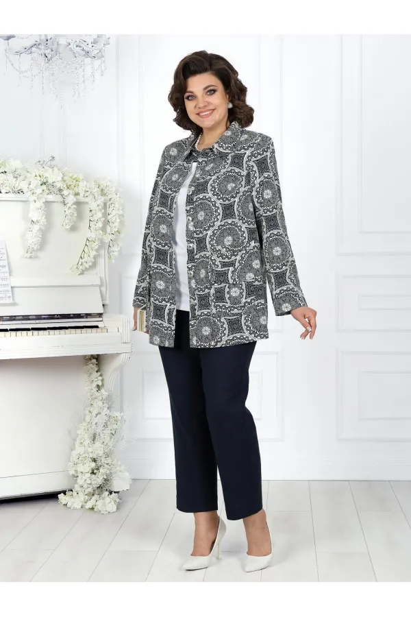 Комплект брючный 3-х предметный, состоящий из блузки, выполненной из отделочной ткани лен принт, брюк, выполненных из однотонного льна и джемпера из трикотажного полотна.
