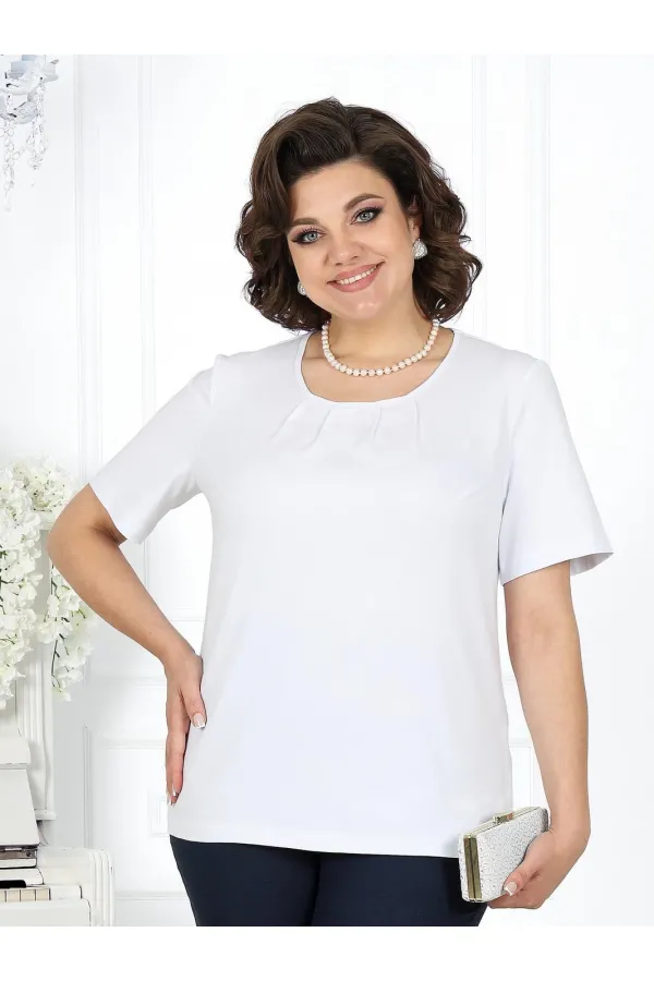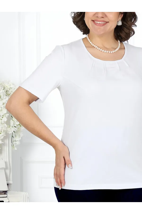 Джемпер полуприлегающего силуэта, длиной по середине спинки 63 см. Перед с нагрудными вытачками, выходящими из пройм. Из горловины вниз застрочены 4 складки. Горловина переда и спинки округлой формы, по переду углубленная. Срезы горловин окантованы косой бейкой. Рукава втачные, одношовные. Длина рукава 26 см.