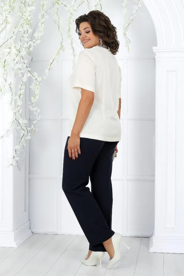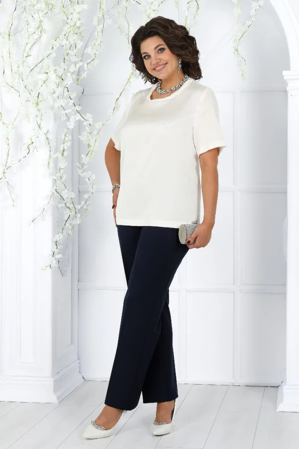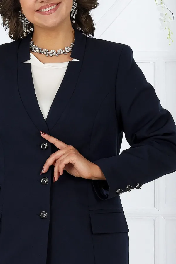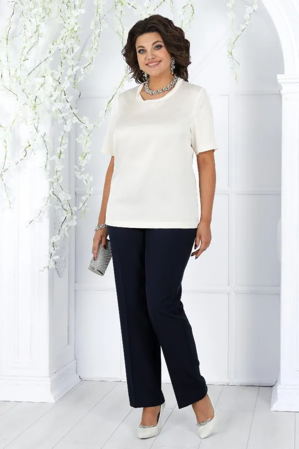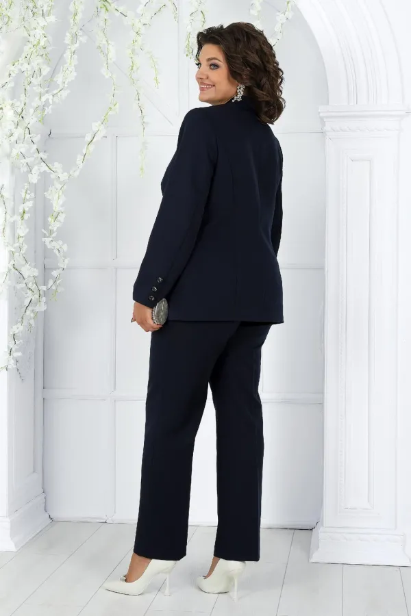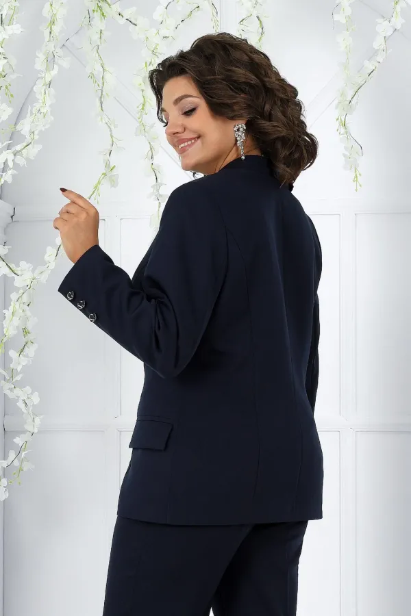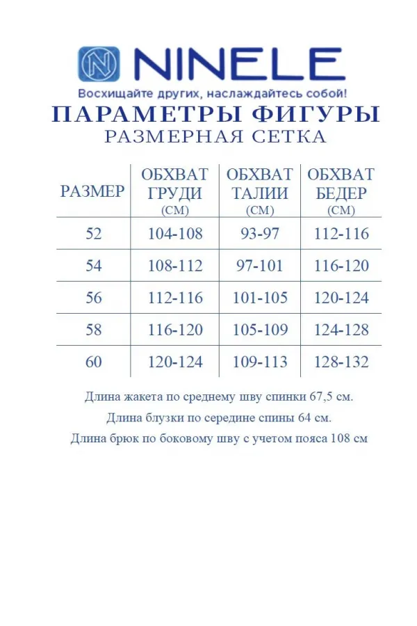 Комплект брючный, состоящий из жакета, брюк и блузки. Жакет полуприлегающего силуэта, на подкладке. Длина по среднему шву спинки 68,0 см. Рельефы переда выходят из проймы, проходят через центр груди вниз. На боковых частях обработаны прорезные карманы “в рамку” с обтачными клапанами с прямыми углами. На правой части выше кармана нашит обтачной клапан. Спинка со средним швом и рельефами, выходящими из проймы вниз. Горловина углублённая спереди, обтачная, воротник стойка с прямыми углами, лацканы без отворота с прямыми углами. Застёжка центральная, однобортная, на 3-и горизонтальные петли и 3- пуговицы, борта внизу прямые. Рукава втачные, двухшовные, длиной 62,0 см. На шлицу локтевого шва нашиты 3-и пуговицы. Изделия с плечевыми накладками.