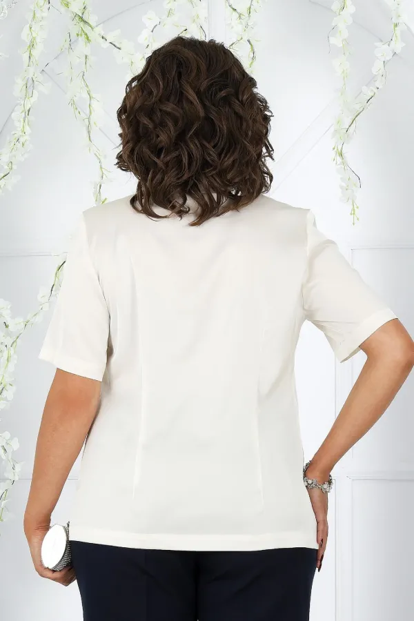 Блуза свободного силуэта. Длина 65,0 см. от шва притачивания воротника. Нагрудные вытачки выходят из проймы. На спинке талевые вытачки. Рукава втачные, одношовные, длиной 28,0 см. Горловина круглая, углублённая спереди, окантованная, воротник с косыми складками- заломами