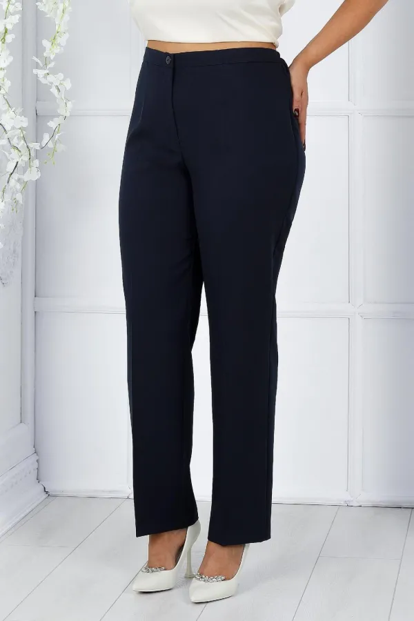 Классические брюки имеют высокую посадку и чуть заужены от середины бедра к низу, с заутюженными стрелками. Модель на притачном поясе, с внутренней резинкой сзади между вытачками, с застёжкой на петлю пуговицу спереди. На задней части талевые вытачки. Спереди застёжка на молнию с гульфиком и откоском.