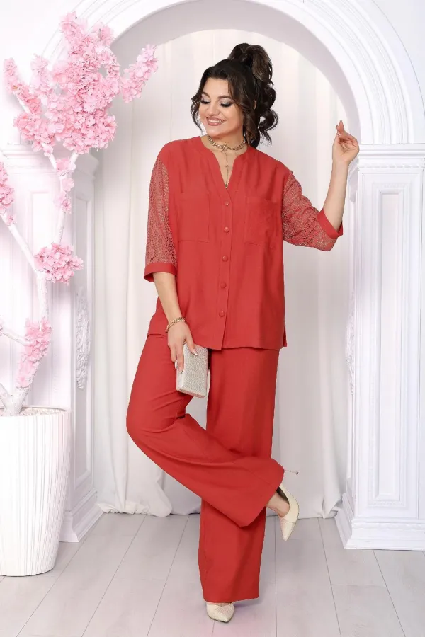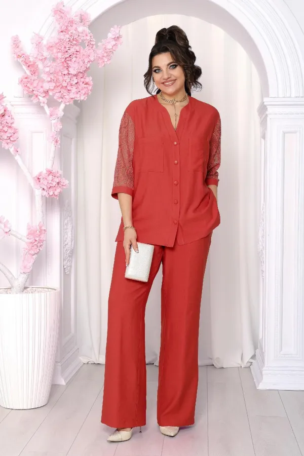 Основным акцентом этого костюма является блузка, дополненная ажурными кружевными рукавами и вставкой, что придает образу нарядность и легкость, а фигурные планки с пуговицами добавляют деловой акцент — идеальное сочетание для офисного гардероба и праздничных мероприятий.