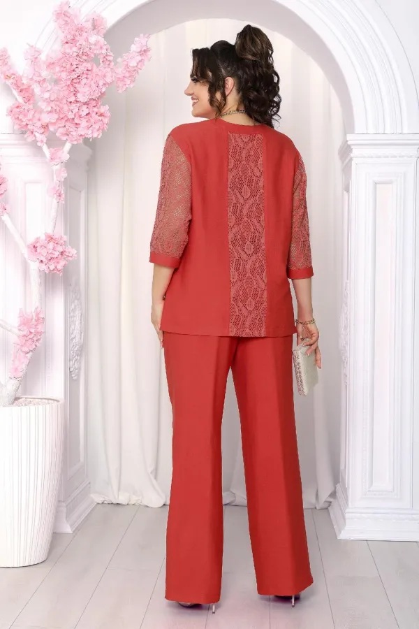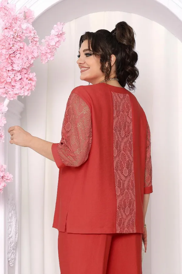 7487 Комплект брючный Основным акцентом этого костюма является блузка, дополненная ажурными кружевными рукавами и вставкой, что придает образу нарядность и легкость, а фигурные планки с пуговицами добавляют деловой акцен... Читать далее...