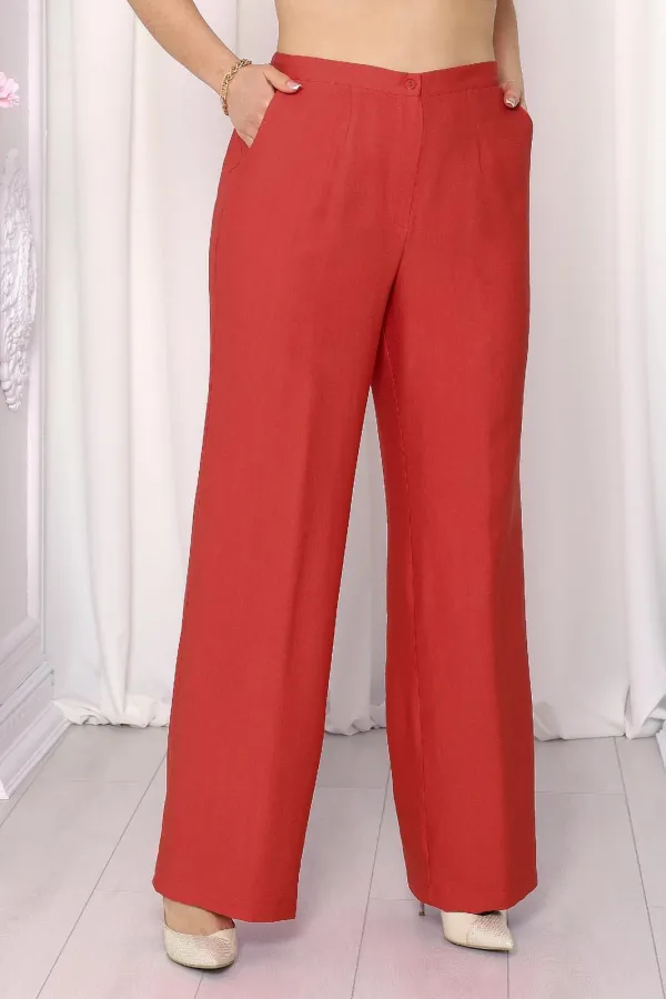 Брюки классические, с посадкой на талии, выполнены из вискозного полотна. Модель с центральной застёжкой на тесьму-«молнию», на притачном поясе, застегивающемся на петлю и пуговицу. Передние и задние половинки брюк с талиевыми вытачками, направленными от пояса вниз. Спереди обработаны боковые наклонные карманы. Для лучшего прилегания брюк в области талии в поясе по задним половинкам вставлена эластичная лента. Длина брюк по боковому (с поясом) – 108 см.