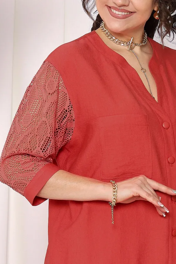 Блузка прямого силуэта, выполнена из вискозного полотна. Модель без плечевых накладок, с разрезами в боковых швах. Перед с накладными карманами и отрезными фигурными планками, застегивающимися на 5 петель и 5 пуговиц. По середине спинки двухслойная вертикальная вставка (верхний – трикотажное кружево, нижний – хлопковая подкладка в цвет); круглая горловина спинки обработана отрезной фигурной бейкой. Рукав короткий, втачной, выполнен из кружева; по низу притачная манжета из основной ткани (манжета без застежки). Длина блузки – 66 см; длина рукава (с манжетой) – 38 см.