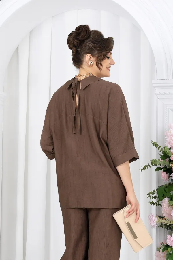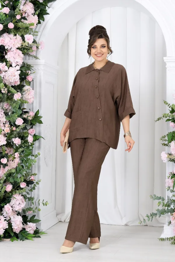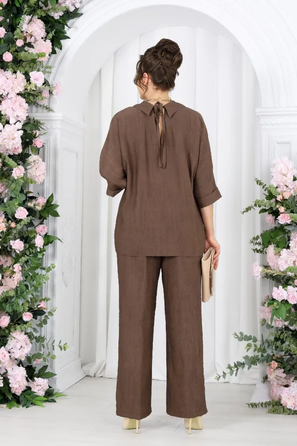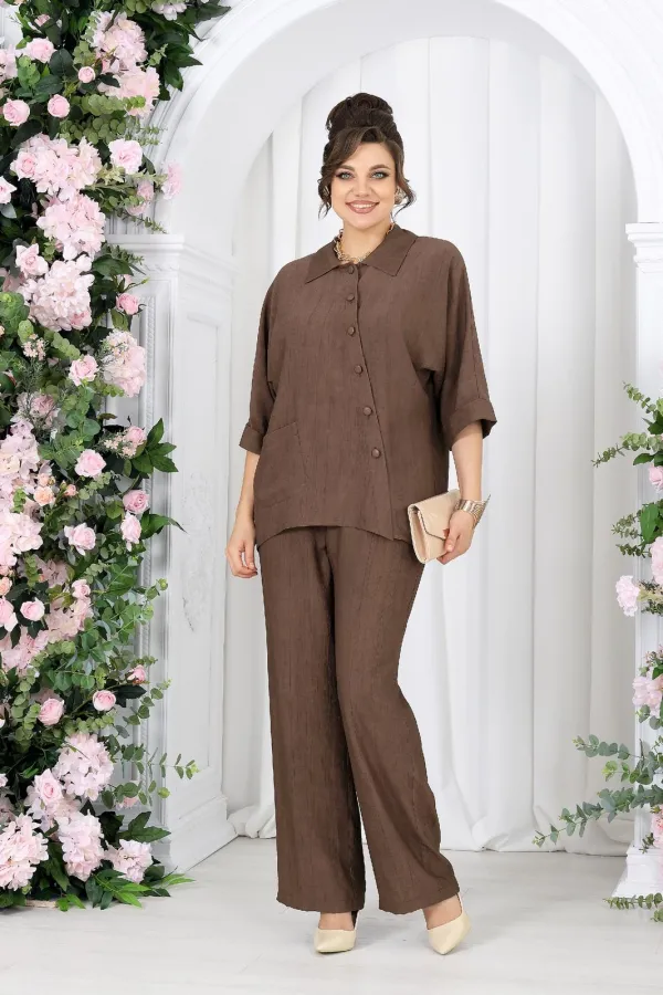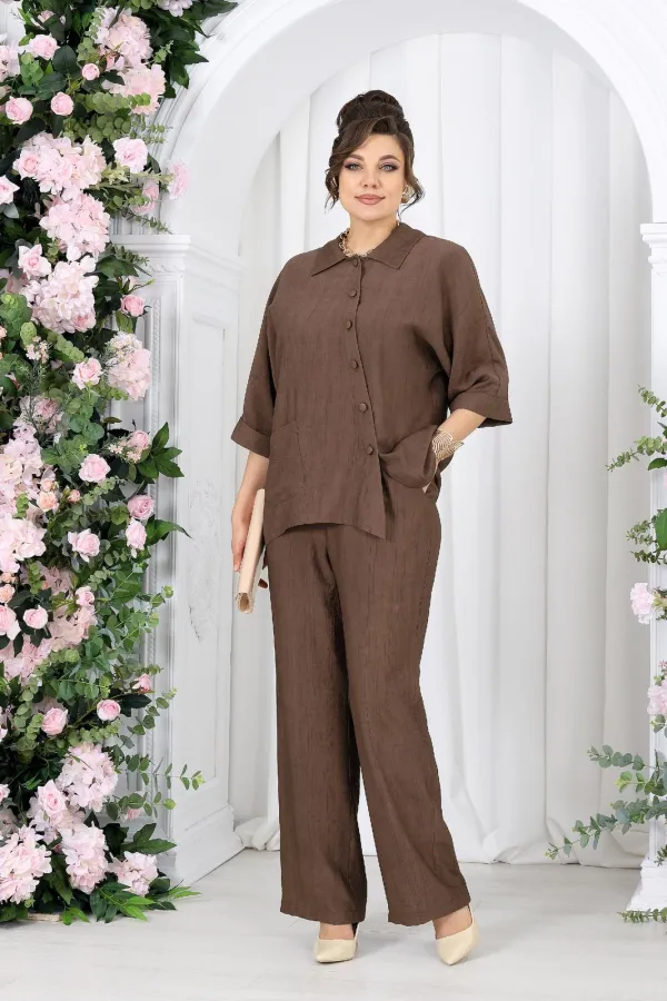 Свобода, легкость и стиль — всё это воплощено в этом изысканном летнем комплекте. Воздушная блузка из мягкого вискозного крэш-полотна очаровывает своим нестандартным кроем: асимметричная застёжка на пуговицах, цельнокроеные рукава длиной ¾ с аккуратными манжетами и оригинальный V-образный вырез на спинке с завязками создают образ, в котором хочется двигаться, жить, вдохновлять. Накладной карман на переде добавляет уютной небрежности — как штрих художника на холсте. Сдержанный, но выразительный. Повседневный, но нарядный. Комплект, в котором чувствуешь себя настоящей женщиной — уверенной, лёгкой, красивой.