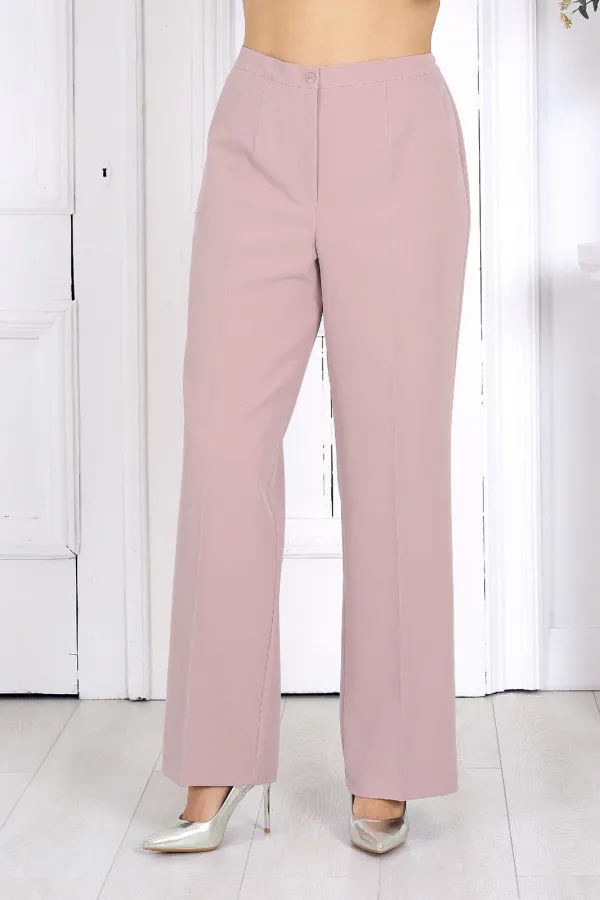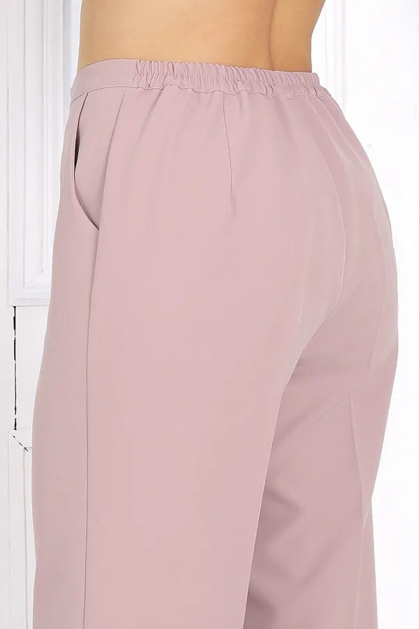 Брюки классические, длинные, с посадкой на талии, выполнены из костюмно- плательной ткани. Модель со стрелками. Передние и задние половинки брюк с талиевыми вытачками, направленными от пояса вниз. Спереди обработаны наклонные боковые карманы и центральная застёжка на тесьму-«молнию». Притачной пояс застегивается на 1 петлю и 1 пуговицу; для лучшего прилегания по линии талии в притачном поясе предусмотрена эластичная лента, вставленная по спинке. Длина брюк по боковому (с поясом) – 107 см.
