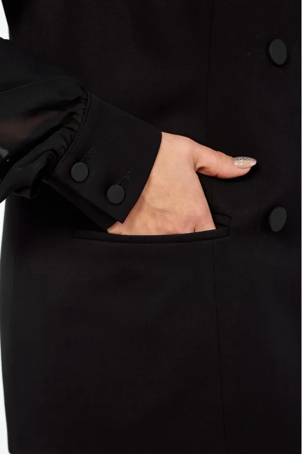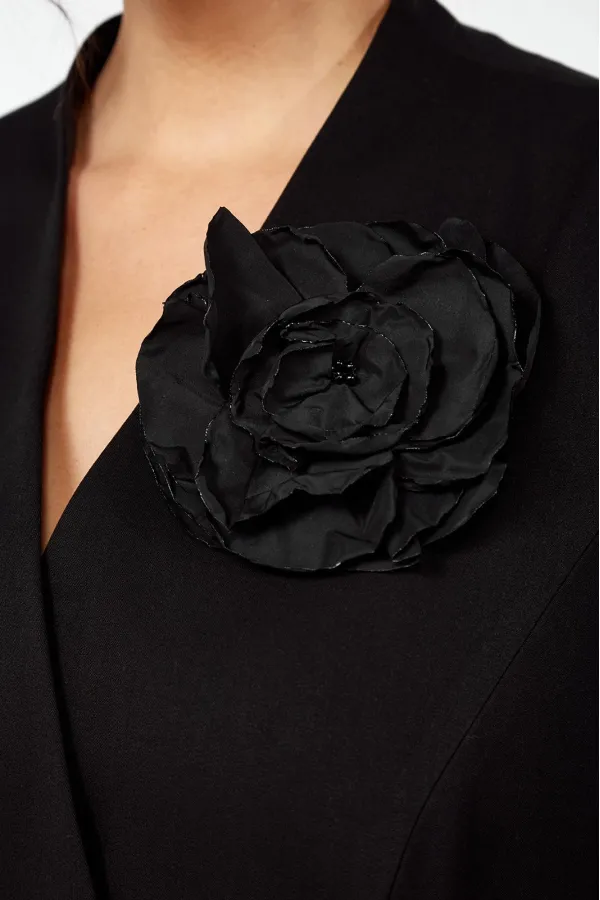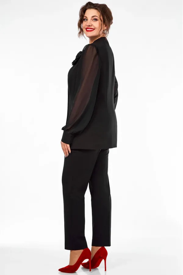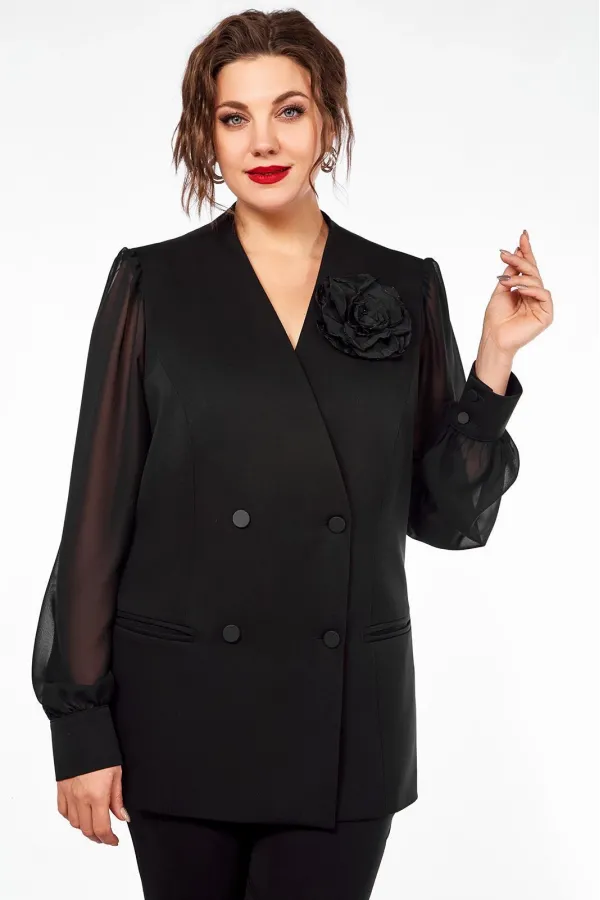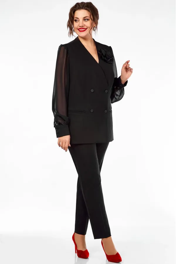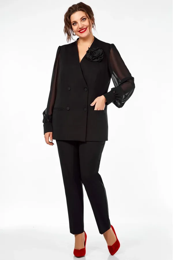 описание: Элегантный костюм из приятной костюмной ткани, состоящий из жакета и брюк. Жакет полуприлегающего силуэта с двубортной застежкой на две пуговицы, без воротника, с рельефными швами, карманами в рамку, декорирован съемным цветком-брошью ручной работы. Рукав из шифоновой ткани, свободный, на манжете. Спинка со средним швом и вытачками. Брюки прямого кроя, слегка заужены к низу. Пояс на резинке по спинке. Длина жакета 75 см, длина рукава 67 см, длина брюк с учетом пояса 107 см.