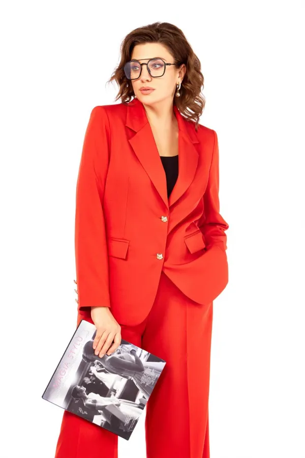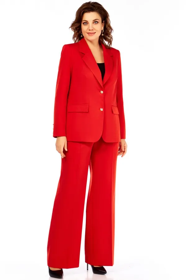 Шикарный костюм, состоит из жакета и брюк. Жакет на подкладке, приталенного силуэта с центральной бортовой застежкой на петли и пуговицы, с отрезным бочком . По переду прорезные карманы с клапаном, спинка со средним швом и вытачками. Рукав втачной двухшовный со шлицами-обманками на петли и пуговицы. Брюки прямые на притачном поясе и боковыми карманами, застежка брюк на тесьму молнию и пуговицу.
