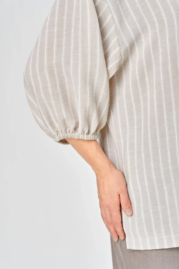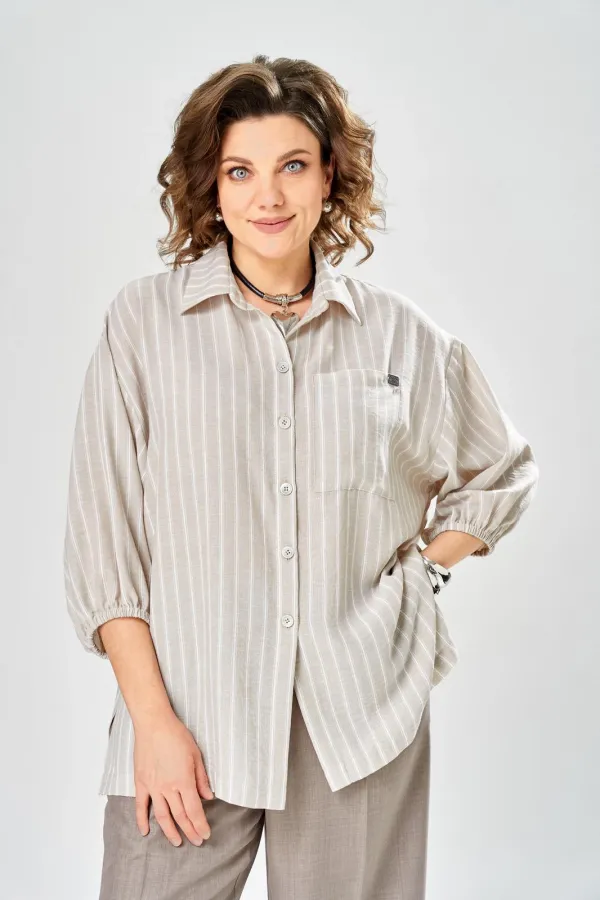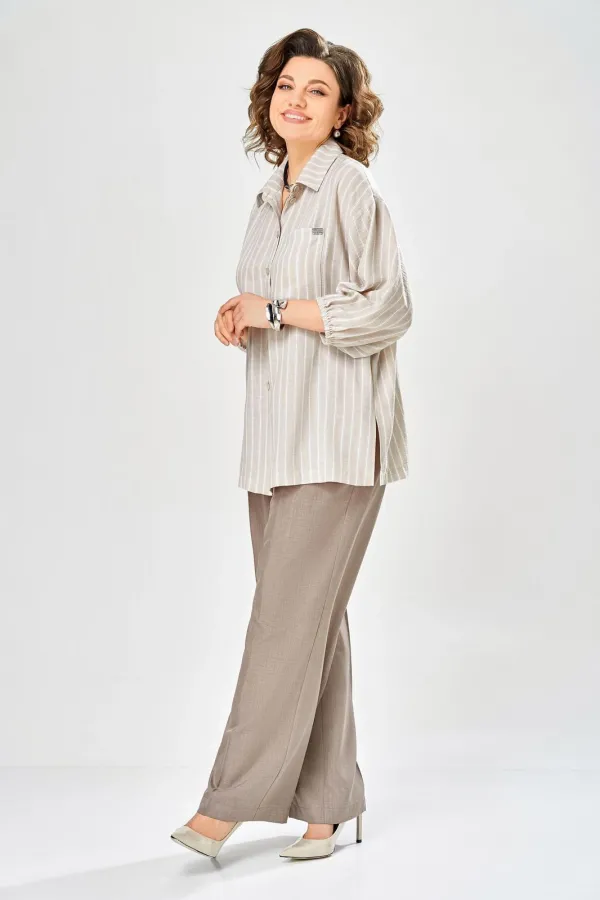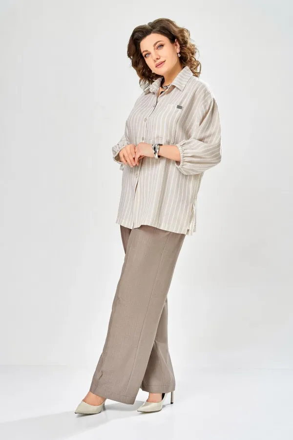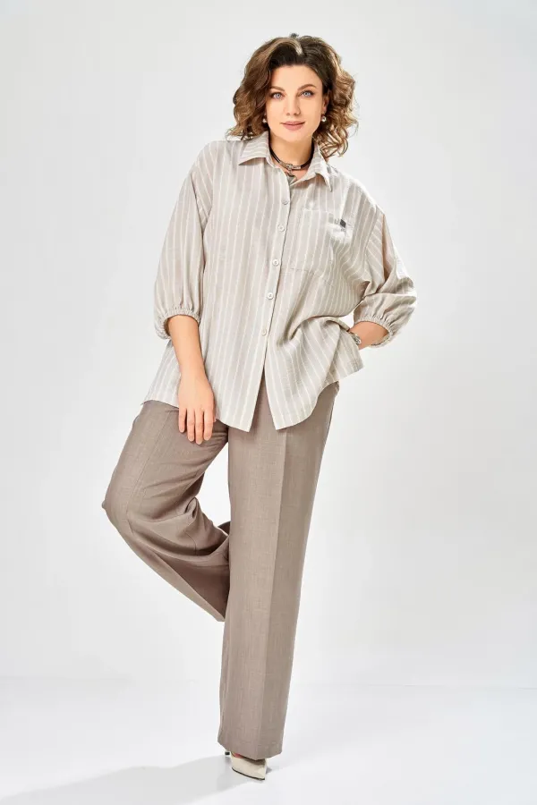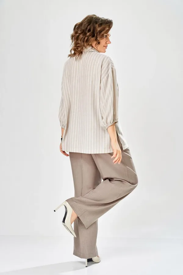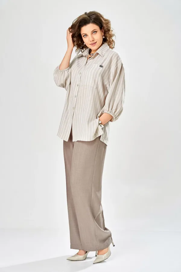 Интересный комплект, состоящий из блузы свободного силуэта и брюк прямого кроя. Блуза с центральной застежкой на петли и пуговицы, воротником рубашечного типа. Рукав спущенный, по низу резинка, длина 3/4. Слева накладной карман, разрезы в боковых швах. Брюки со стрелками, карманы в боковых швах, пояс частично на резинке.