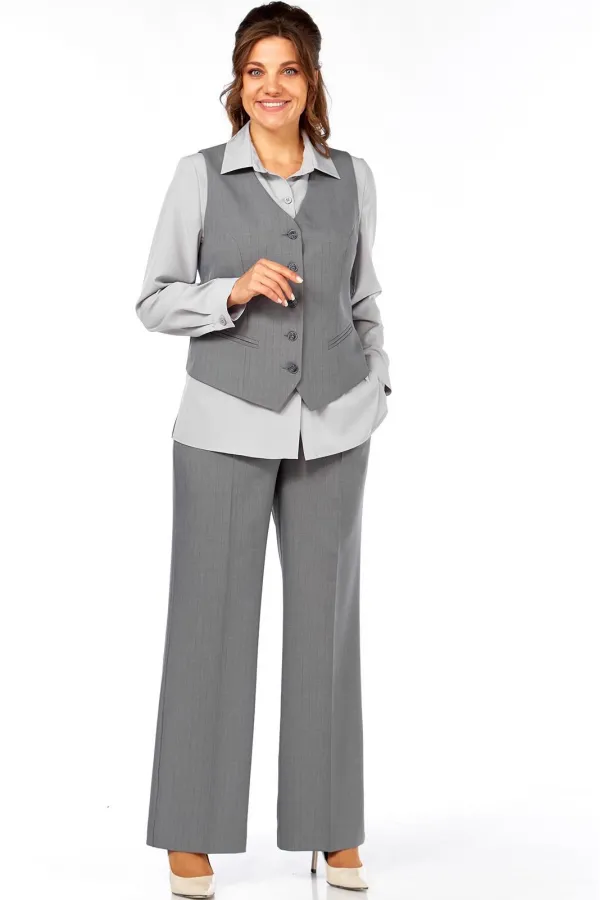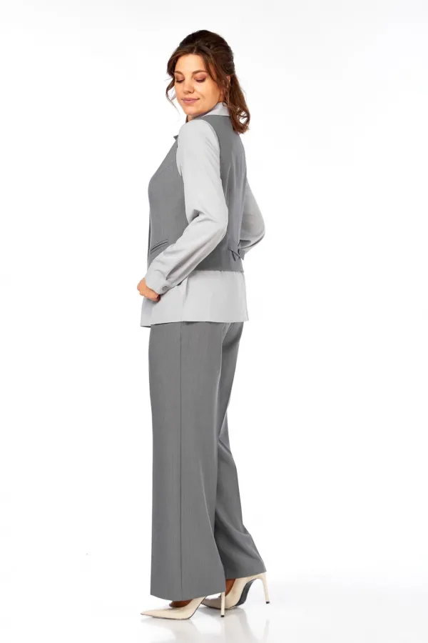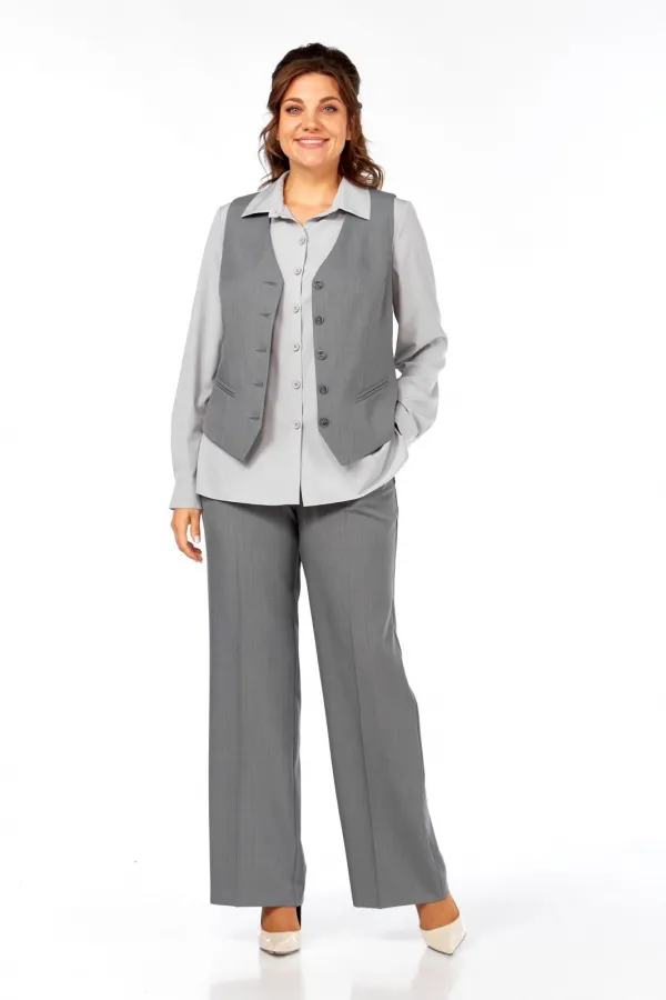 Комплект женский, состоит из блузки, жилета и брюк. Полуприлегающий силуэт, жилет с V-образной формой горловины, на переде рельефы от проймы, имитация карманов в рамку, по спинке хлястик с пуговицей. Блузка с рубашечным воротником и застежкой на петли и пуговицы, нагрудные вытачки, рукав одношовный с манжетой. Разрезы в боковых швах. Брюки прямые, с карманами. Пояс по спинке на резинке. На переде и спинке заутюжены стрелки.