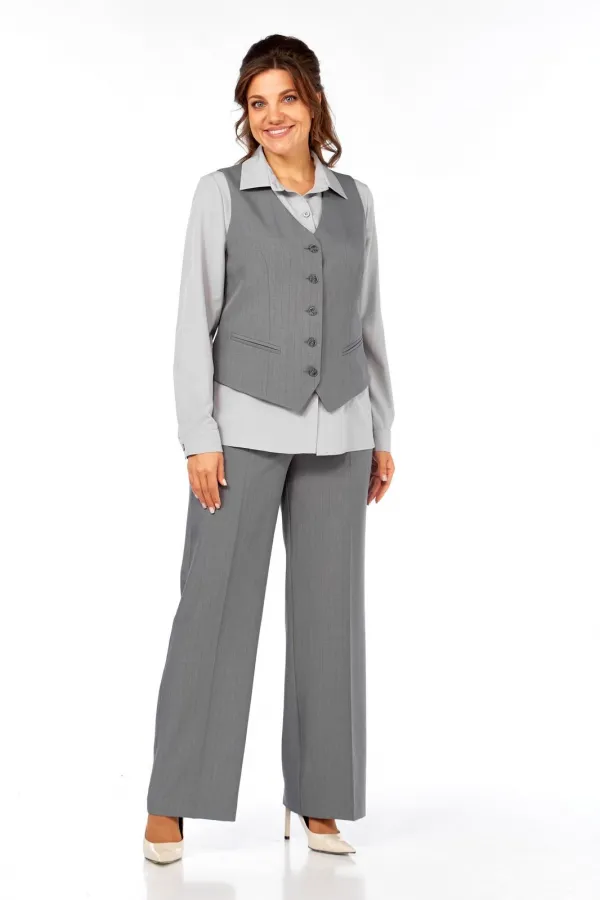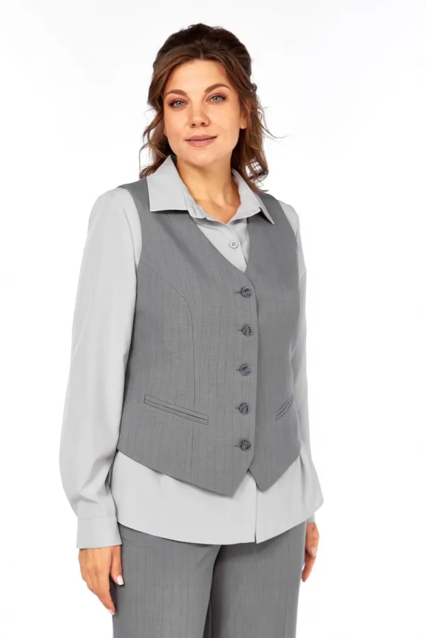 Комплект женский, состоит из блузки, жилета и брюк. Полуприлегающий силуэт, жилет с V-образной формой горловины, на переде рельефы от проймы, имитация карманов в рамку, по спинке хлястик с пуговицей. Блузка с рубашечным ... Читать далее...