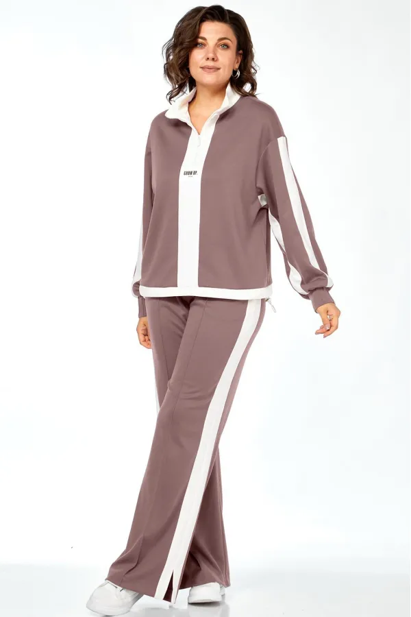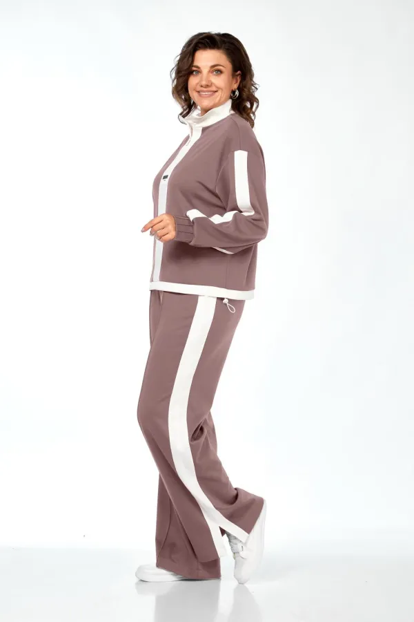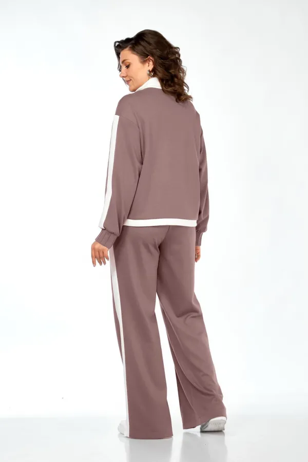 Костюм женский спорт-шик. Джемпер прямого силуэта, со спущенным рукавом. Воротник-стойка из отделочной ткани, планка по центру, в которой вставлена молния, декаротивная нашивка. Рукав с планками из отделочной ткани и декоративные защипы на манжетах. По низу кулиска с фиксаторами. Брюки прямые, по переду застрочены стрелки, по внешней стороне отделочные детали с разрезами по низу. Карманы в боковых швах, пояс на резинке.