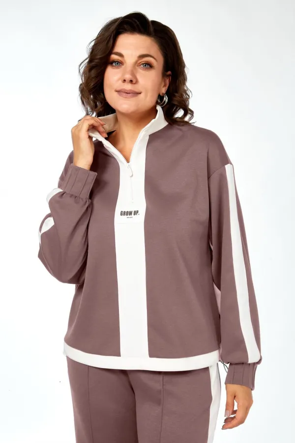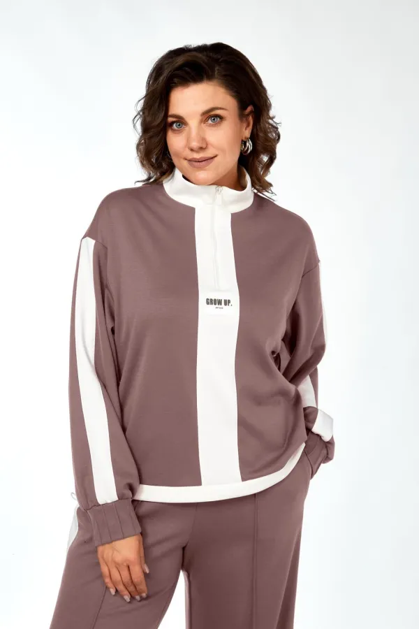 Костюм женский спорт-шик. Джемпер прямого силуэта, со спущенным рукавом. Воротник-стойка из отделочной ткани, планка по центру, в которой вставлена молния, декаротивная нашивка. Рукав с планками из отделочной ткани и дек... Читать далее...