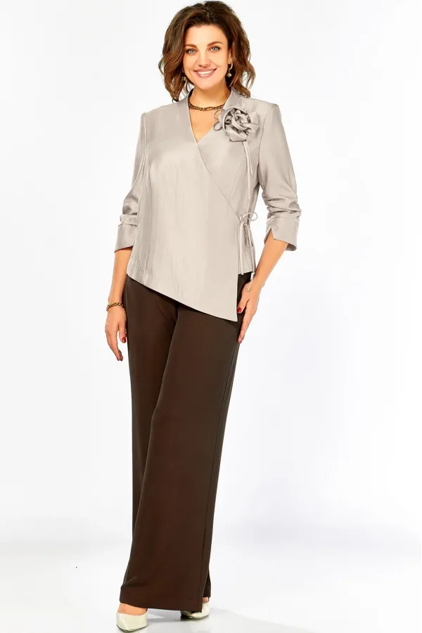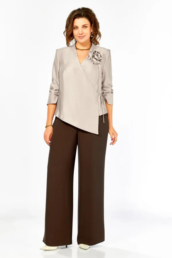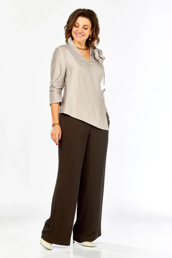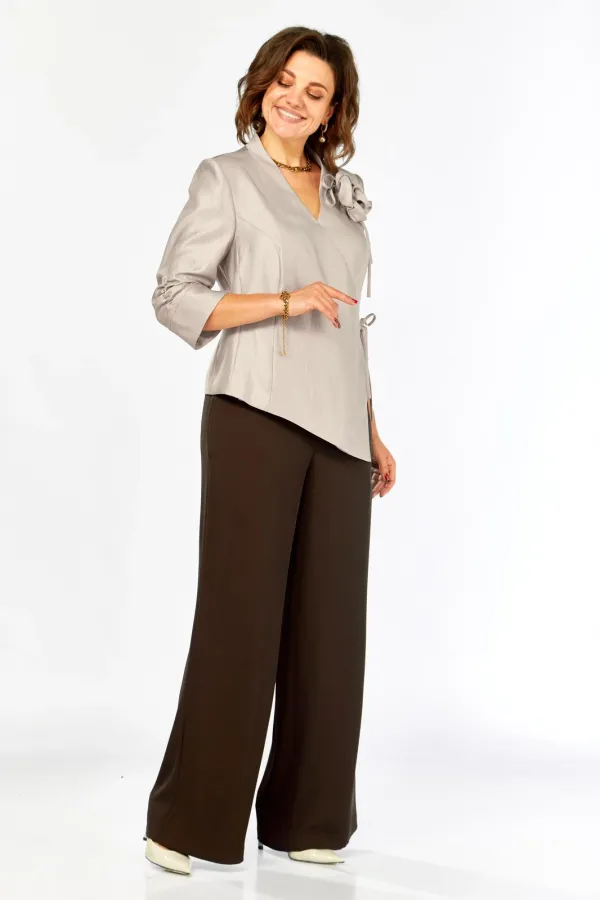 Нарядный комплект полуприлегающего силуэта. Блуза с запахом, V-образным вырезом горловины и цельнокроеной стойкой. Застежка-завязка. Спинка со средним швом и талиевыми вытачками. Рукав 3/4, присобран, по низу фигурная манжета. Брюки прямые на поясе. Пояс по спинке на резинке. Карманы в боковых швах.