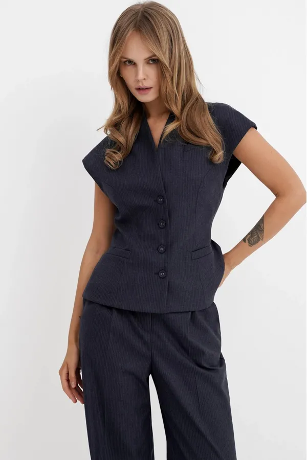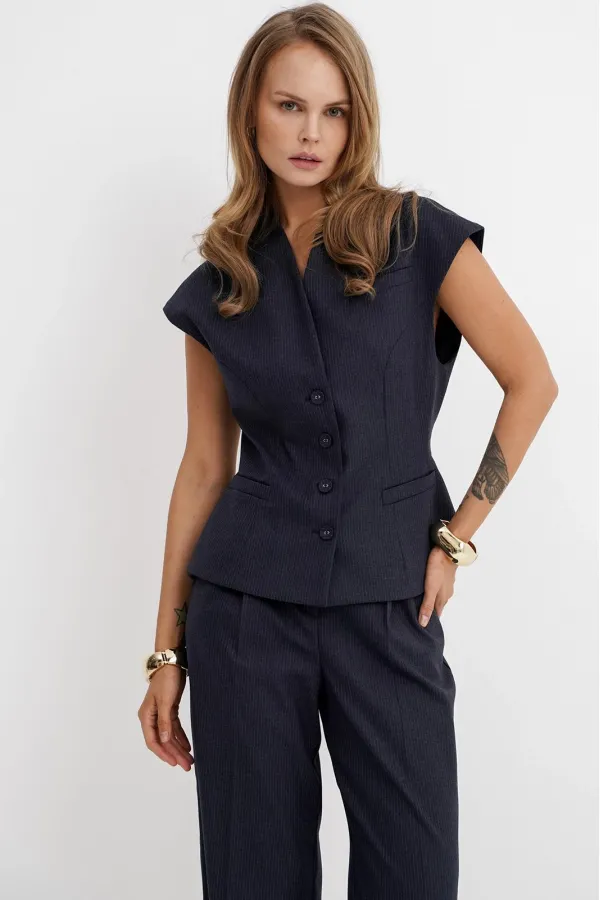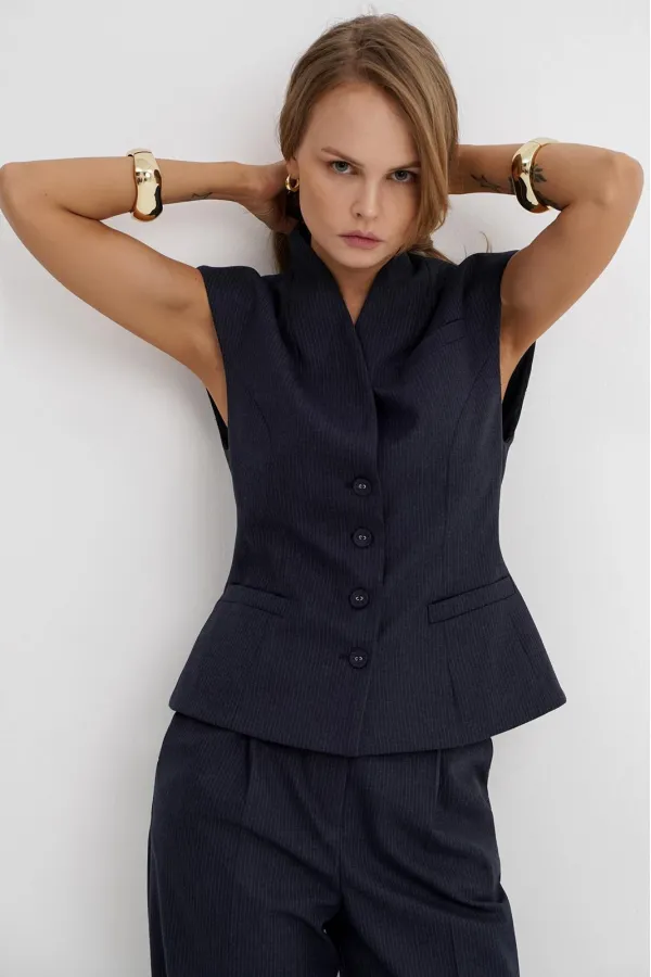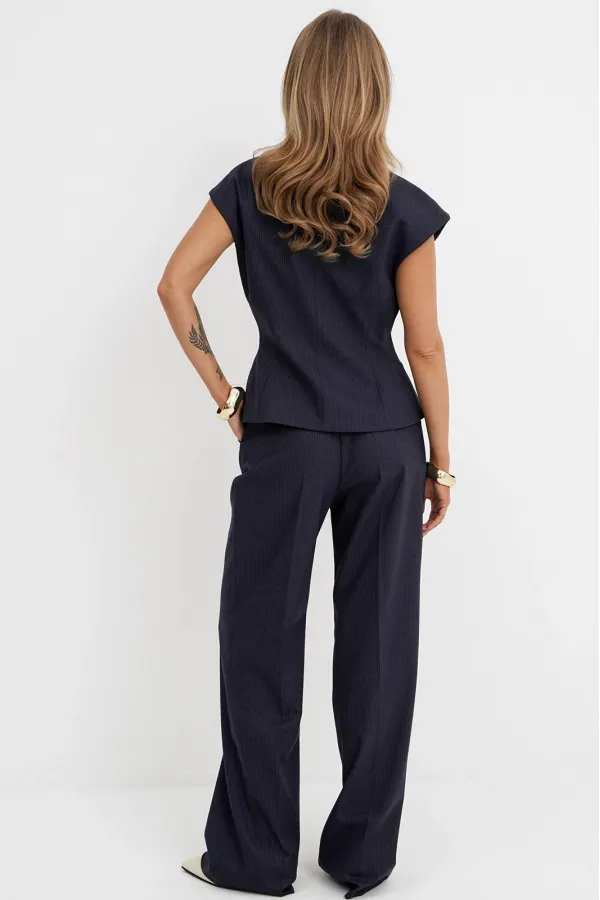 Костюм-двойка из приталенного жилета с воротником-стойкой и широких прямых брюк из текстильной ткани с рисунком «ёлочка».