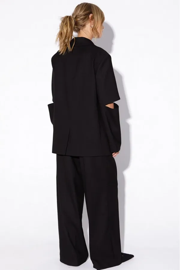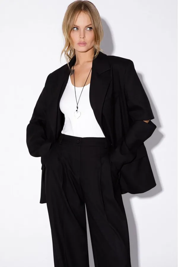 Текстильный костюм-двойка из оверсайз жакета с разрезами по рукавам и широких брюк-палаццо.