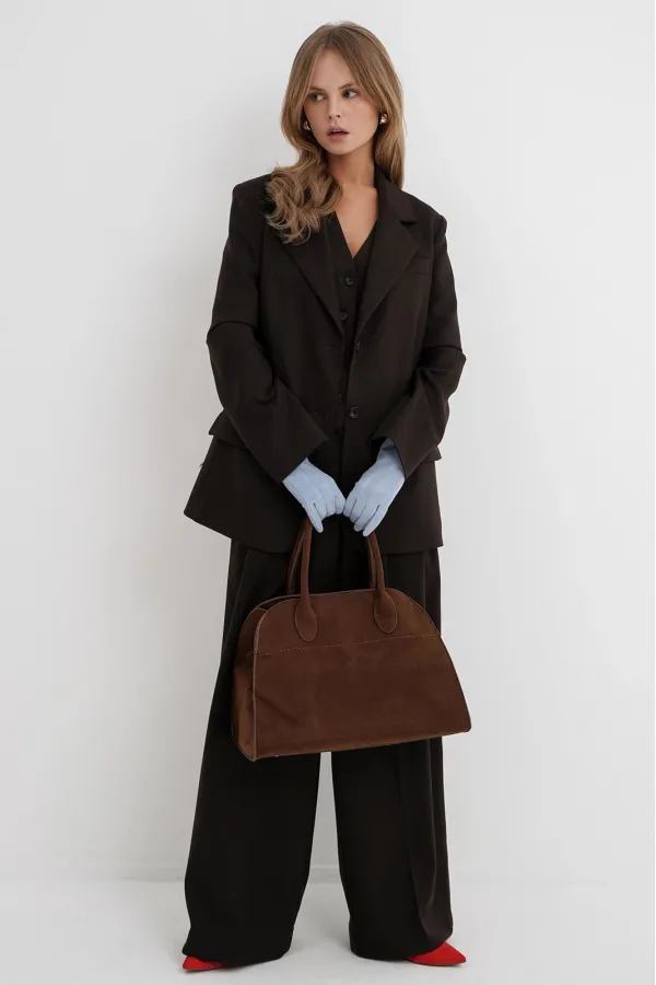 Текстильный костюм-двойка из оверсайз жакета с разрезами по рукавам и широких брюк-палаццо.