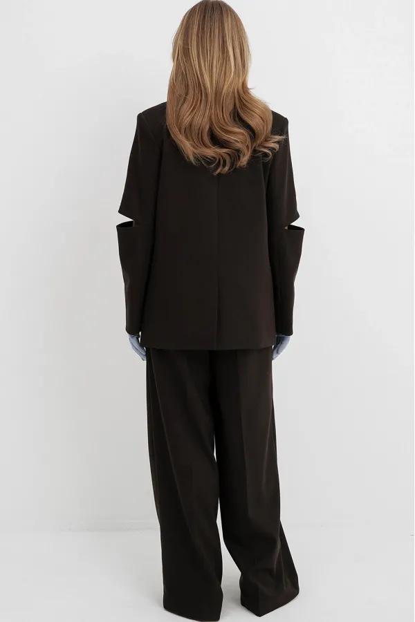 Текстильный костюм-тройка из оверсайз жакета с разрезами по рукавам, полуприлегающего жилета и широких брюк-палаццо. Детали: жакет свободного покроя, прямой силуэт, застежка на петли и пуговицы, функциональные карманы, жакет на подкладке. Жилет полуприлегающего силуэта, талиевые вытачками, застежка на петли и пуговицы, функциональные карманы, фигурный низ, на подкладке. Брюки с притачным поясом со шлевками, перед со складками и заутюженными стрелками, застежка на молнию и пуговицу, боковые карманы. Задние части брюк с вытачками и имитацией карманов. Длина жакета по спинке около 71 см в размерах 40-48 и около 73 см в размерах 50-52, длина рукава около 61 см. Длина жилета по спинке около 48,5 см в размерах 40-46 и около 51,5 см в размерах 48-52. Длина брюк по боковому шву с поясом около 109,5 см, длина по внутреннему шву около 83 см.