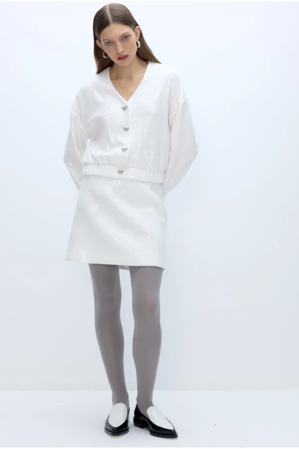 Костюм-двойка из укороченного бомбера и мини-юбки из велюровой ткани в пайетки.