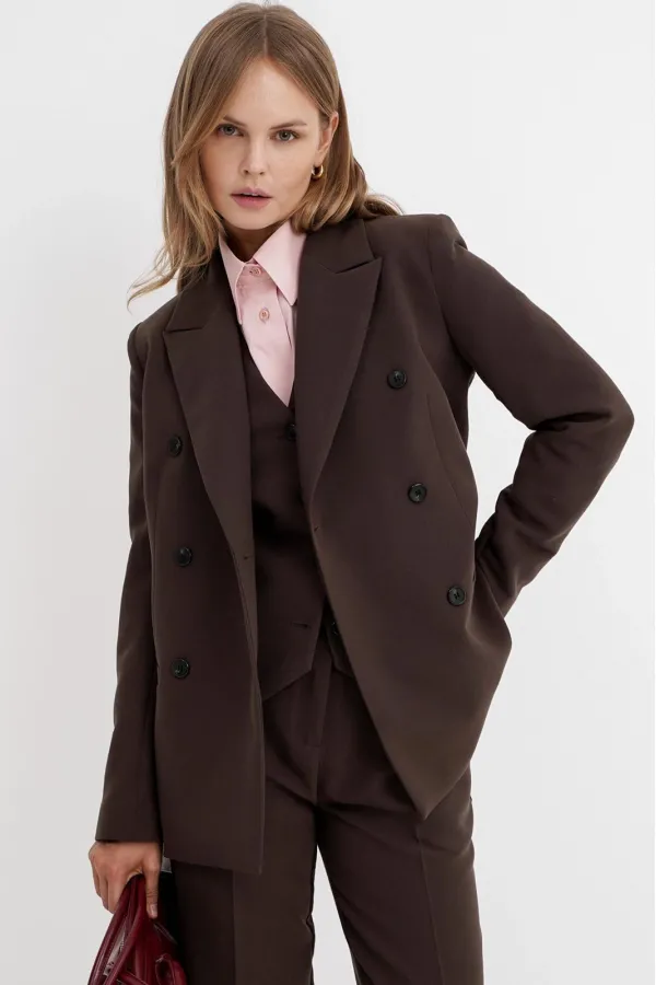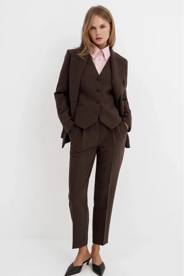 Текстильный костюм-тройка из двубортного жакета, полуприлегающего жилета и укороченных брюк со средней посадкой.