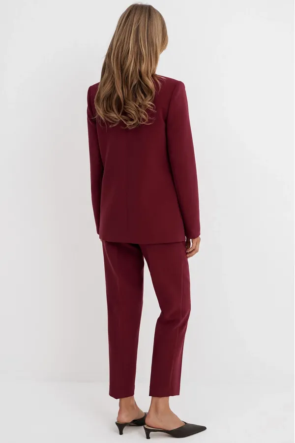 Детали: жакет прямого силуэта, пиджачный воротник, перед с прорезными карманами, застежка на петли и пуговицы, спинка со средним швом, рукава втачные двухшовные, жакет на подкладке. Жилет полуприлегающего силуэта с фигурным низом, застежка на петли и пуговицы, на подкладке. Брюки на притачном поясе со шлевками, передние половины с небольшими мягкими складками и заутюженными стрелками, застежка на молнию и пуговицу, боковые карманы.