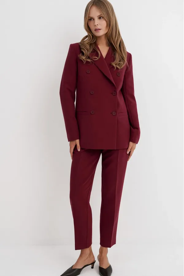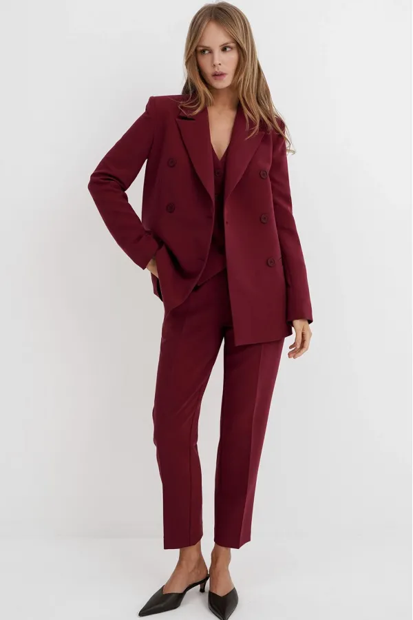Текстильный костюм-тройка из двубортного жакета, полуприлегающего жилета и укороченных брюк со средней посадкой.