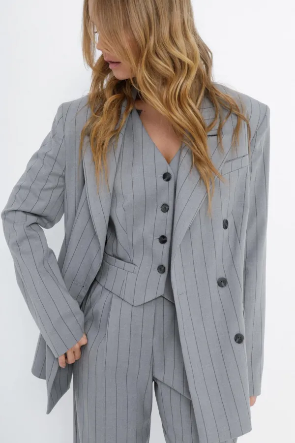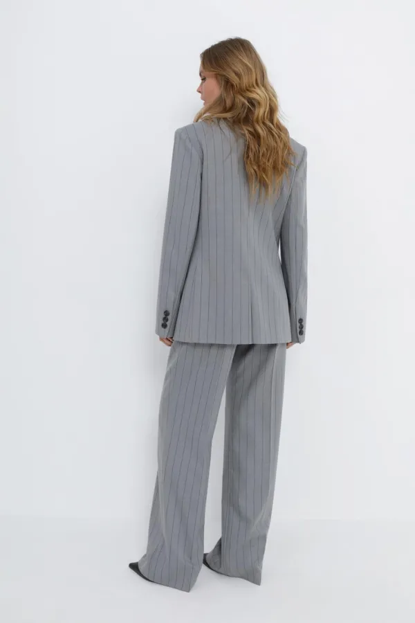 Костюм-двойка в полоску из свободного жакета и прямых широких брюк со стрелками.