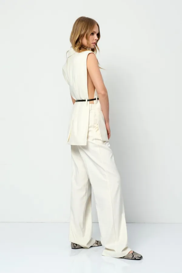 Костюм-двойка из прямого жилета и широких брюк со стрелками. Детали: жилет прямого силуэта, талиевые вытачки переда и спинки, пиджачный воротник, застежка на пришивные кнопки, спинка со средним швом и шлицей, функциональные карманы, жилет на подкладке, в комплекте пояс из основной ткани и чёрный пояс-шнурок из кожзама. Брюки с высокой посадкой, притачной пояс со шлевками, передние половины с небольшими застроченными мягкими складками и заутюженными стрелками, застежка на молнию и пуговицу, боковые карманы. Задние части брюк с вытачками и заутюженными стрелками. Пояс брюк прямой, без резинки. Длина жилета по спинке около 69 см в размерах 40-46 и около 71 см в размерах 48-52. Длина брюк по боковому шву с поясом около 114 в размерах 40-46 и около 115,5 см в размерах 48-52. Длина по внутреннему шву около 83 см
