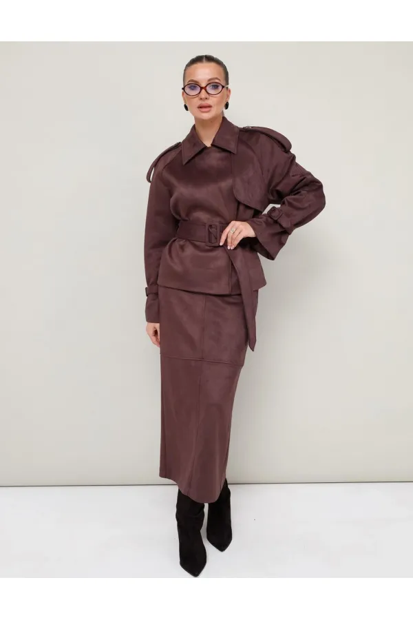 Стильный 2-предметный комплект, состоящий из жакета и юбки, выполненный из экозамши.
