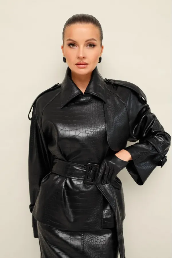 Стильный 2-предметный комплект, состоящий из жакета и юбки, выполненный из экокожи.