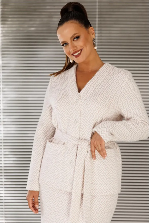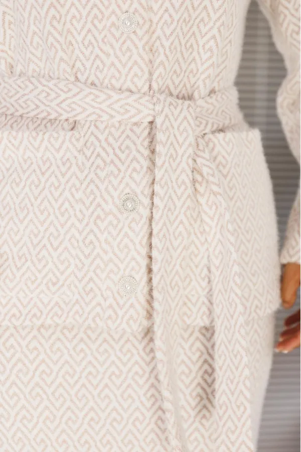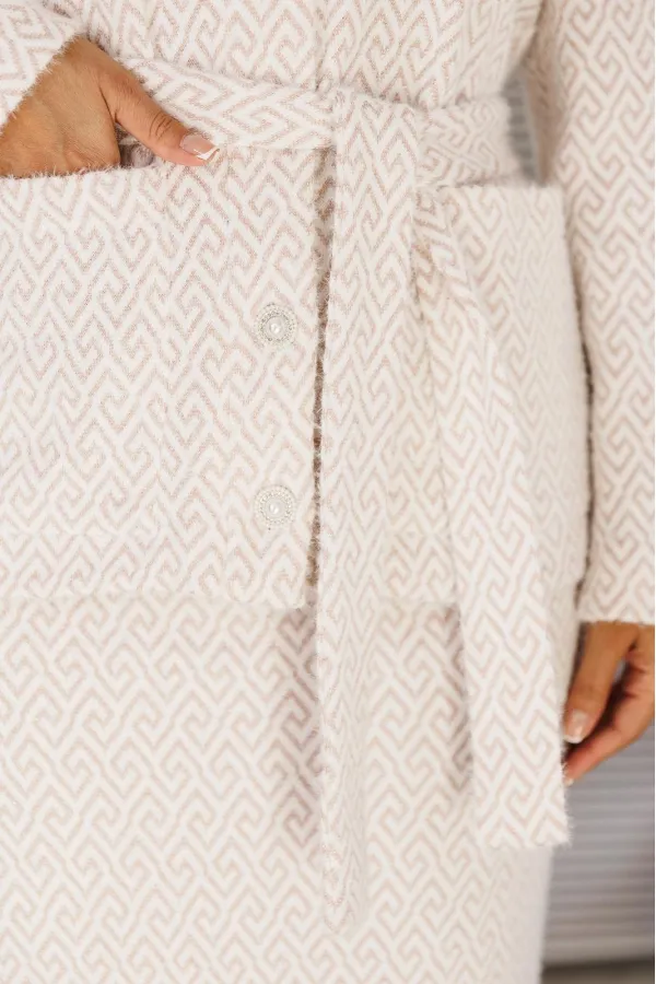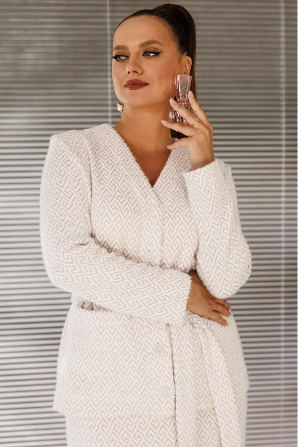 Костюм женский из трикотажной ткани. Жакет имеет V образный вырез. Застёгивается на 5 петель- пуговиц.Спереди накладные карманы. Жакет завязывается на пояс.