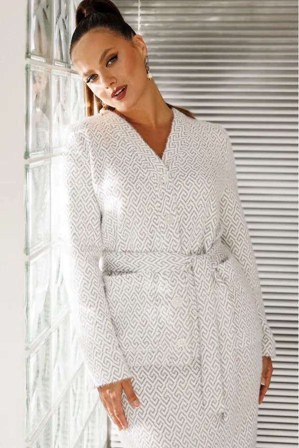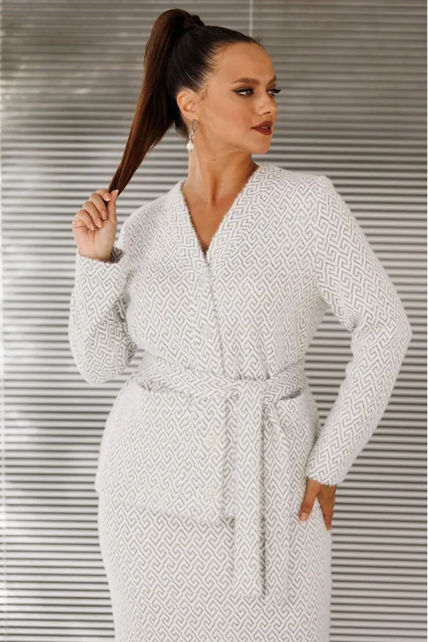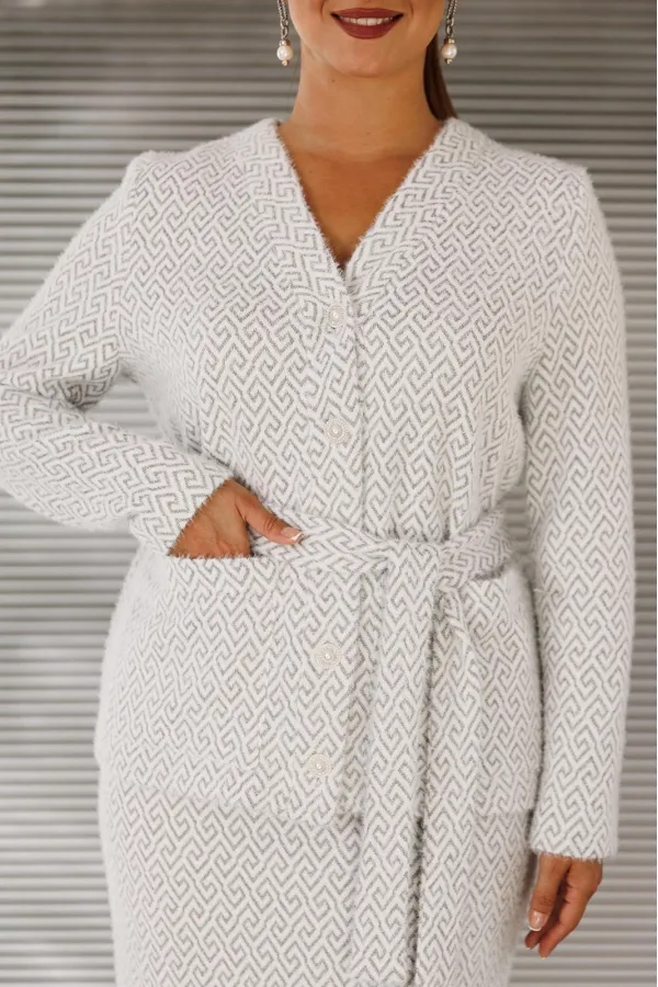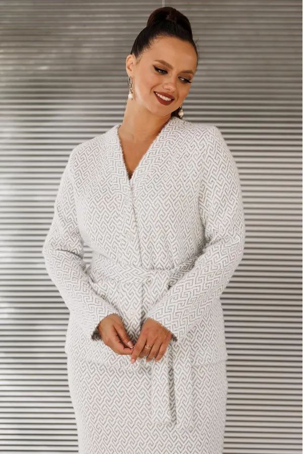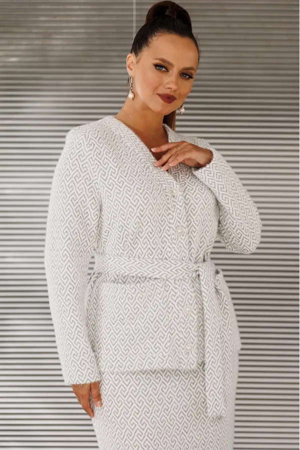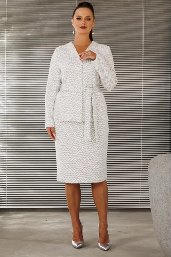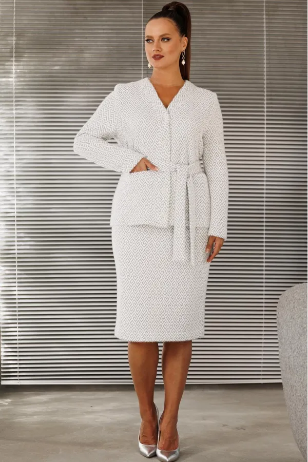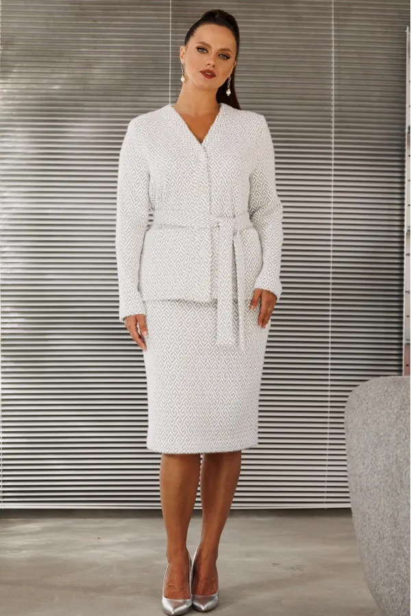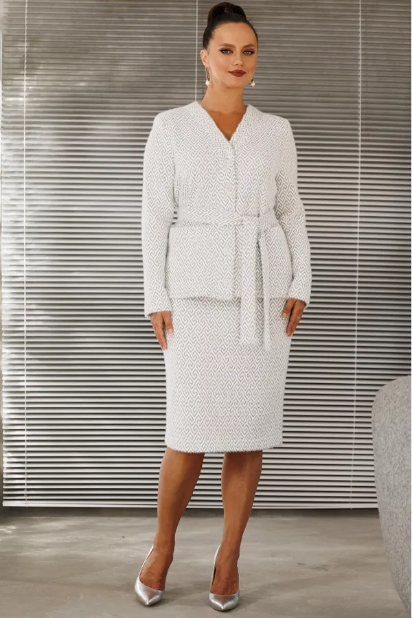 Костюм женский из трикотажной ткани. Жакет имеет V образный вырез. Застёгивается на 5 петель- пуговиц.Спереди накладные карманы. Жакет завязывается на пояс.