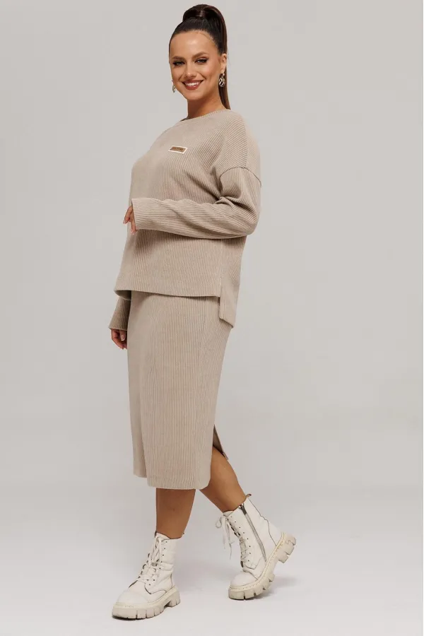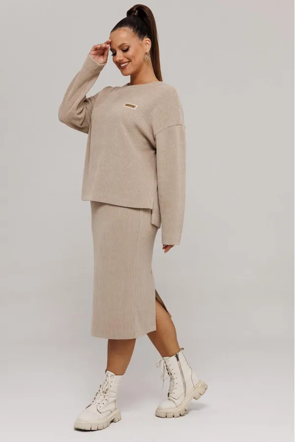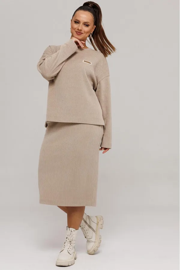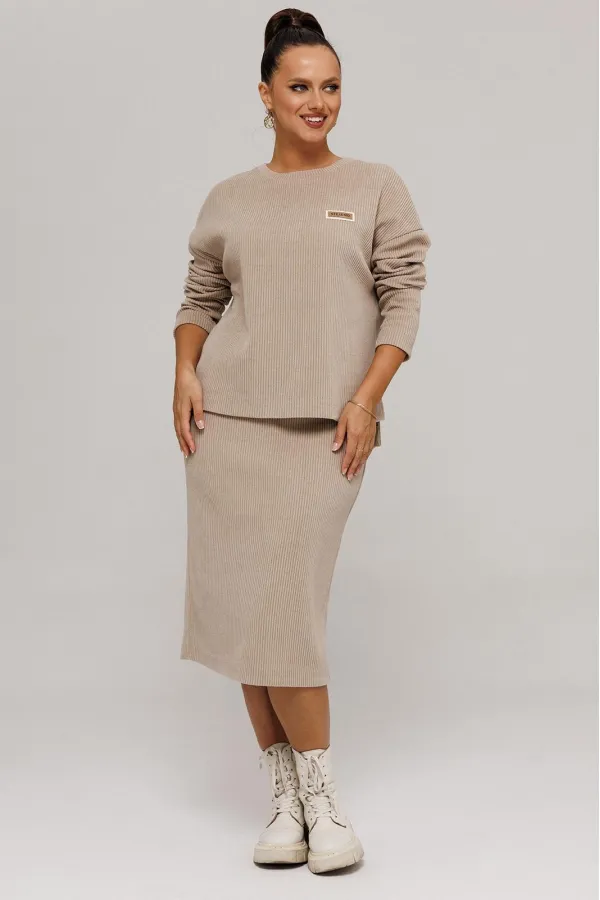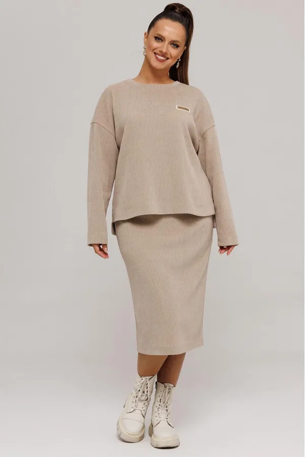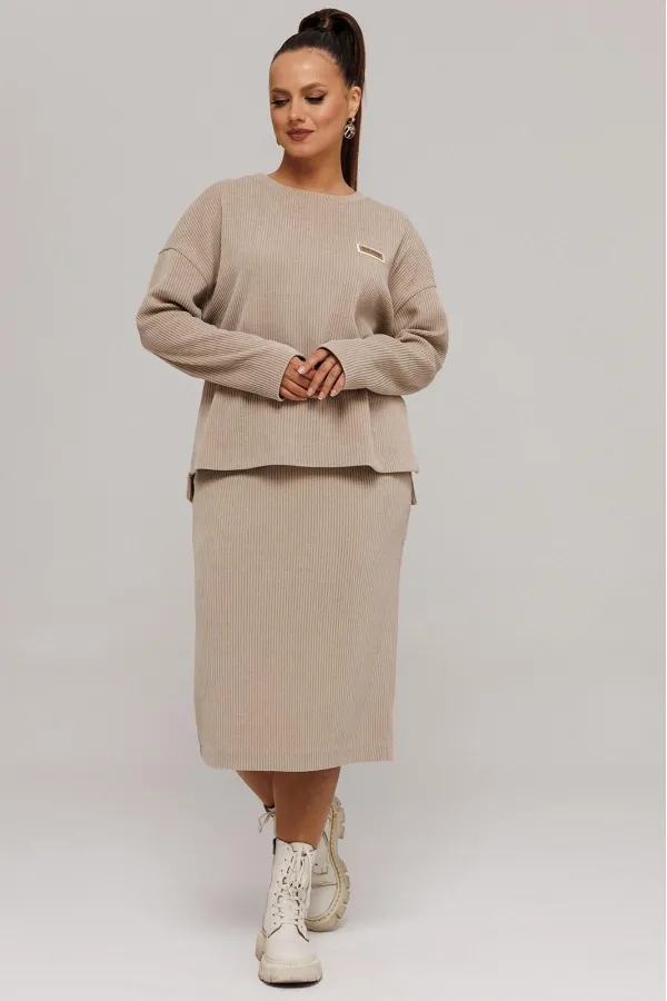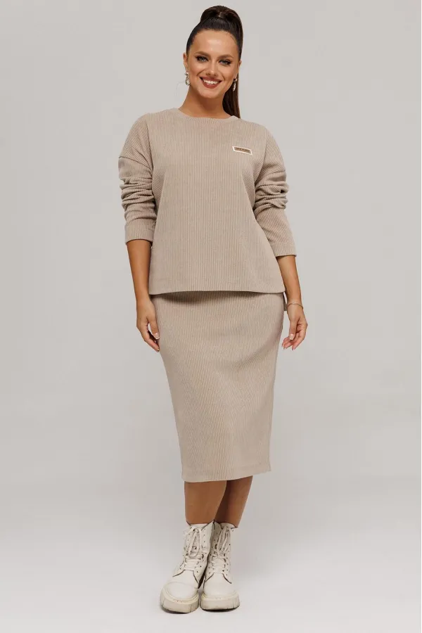 Данный комплект выполнен из мягкого трикотажного полотна, идеально подойдёт для демисезонного периода, благодаря натуральному составу в нём будет тепло но не жарко. Свитшот свободного кроя с длинными рукавами и спущенным плечом, предаёт образу мягкость и непринуждённость. Горловина выполнила из отделочной ткани в рубчик, что является очень функциональным и стильным элементом. Юбка прямая, на подкладке, на поясе, слегка зауженная к низу. Длина ниже линии колена. Средний шов юбки заканчивается шлицей.