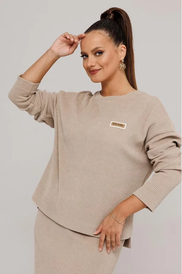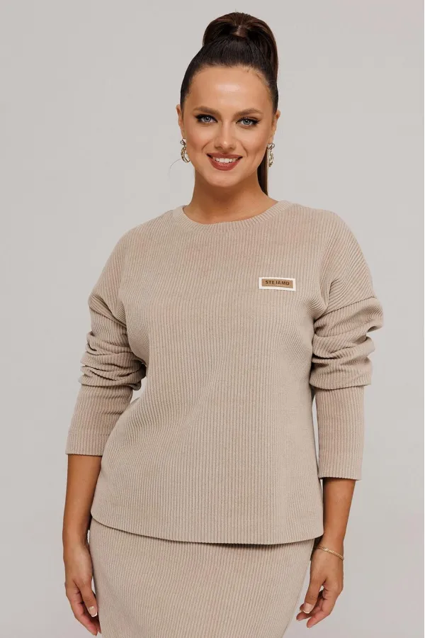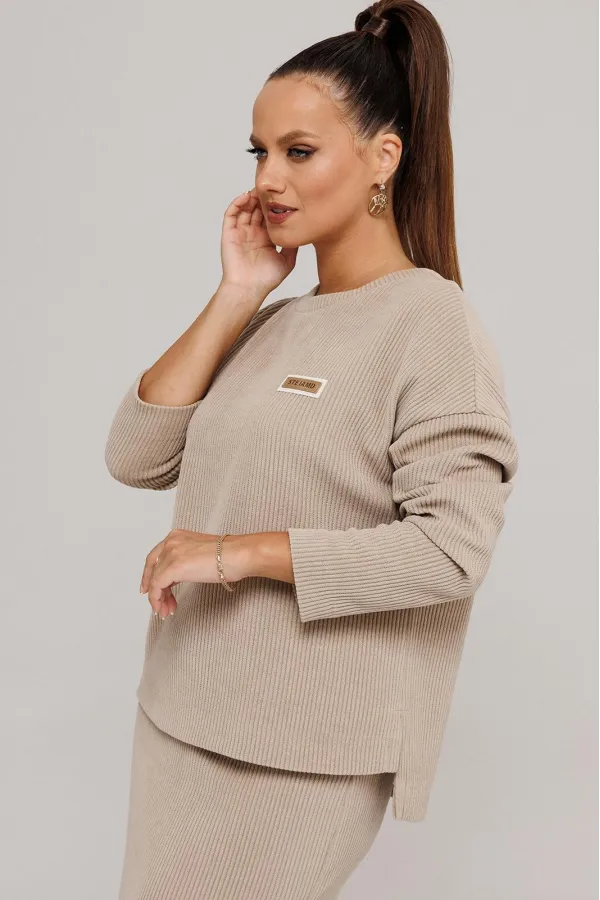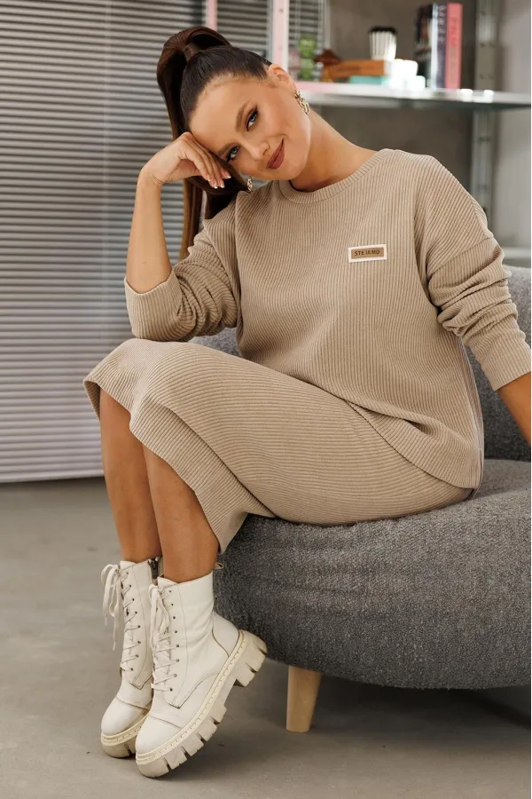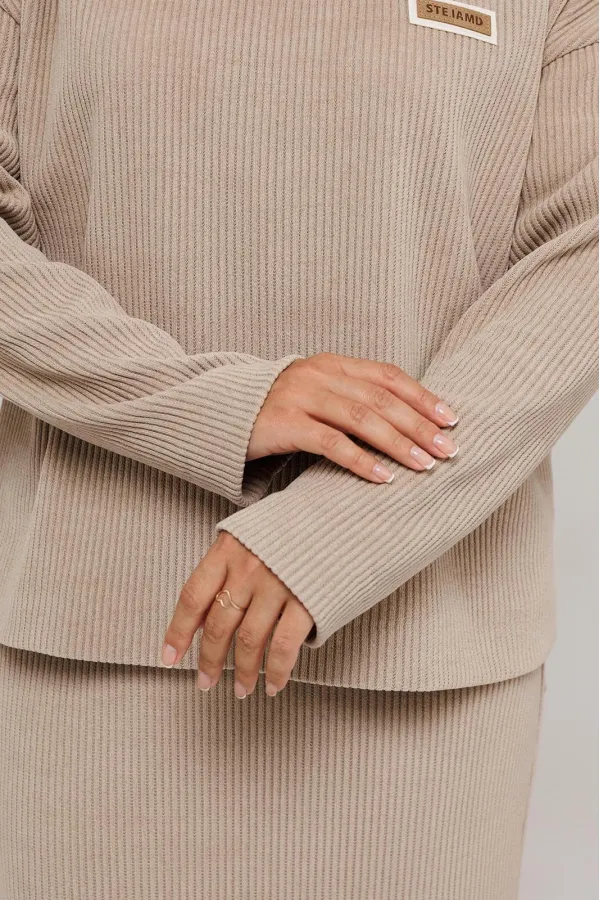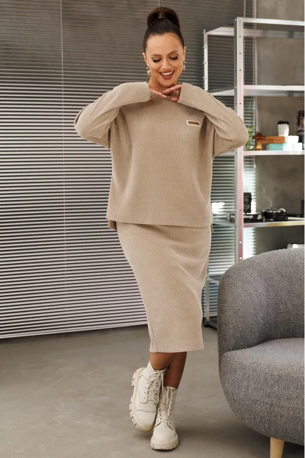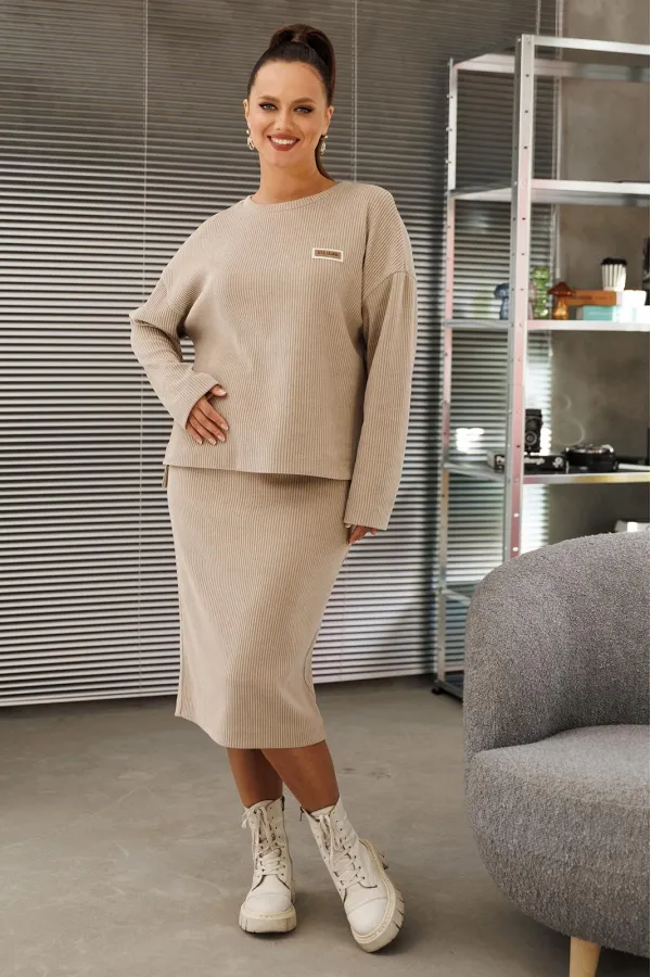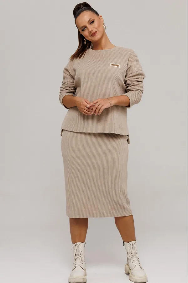 Данный комплект выполнен из мягкого трикотажного полотна, идеально подойдёт для демисезонного периода, благодаря натуральному составу в нём будет тепло но не жарко. Свитшот свободного кроя с длинными рукавами и спущенным плечом, предаёт образу мягкость и непринуждённость. Горловина выполнила из отделочной ткани в рубчик, что является очень функциональным и стильным элементом. Юбка прямая, на подкладке, на поясе, слегка зауженная к низу. Длина ниже линии колена. Средний шов юбки заканчивается шлицей.