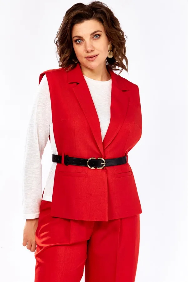- Жилет: приталенный крой подчёркивает линии силуэта, а V-образный вырез визуально удлиняет шею и делает образ более утончённым. Застёжка на потайные кнопки добавляет аккуратности и минимализма.