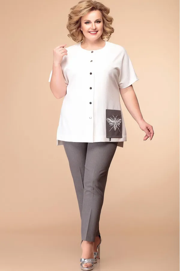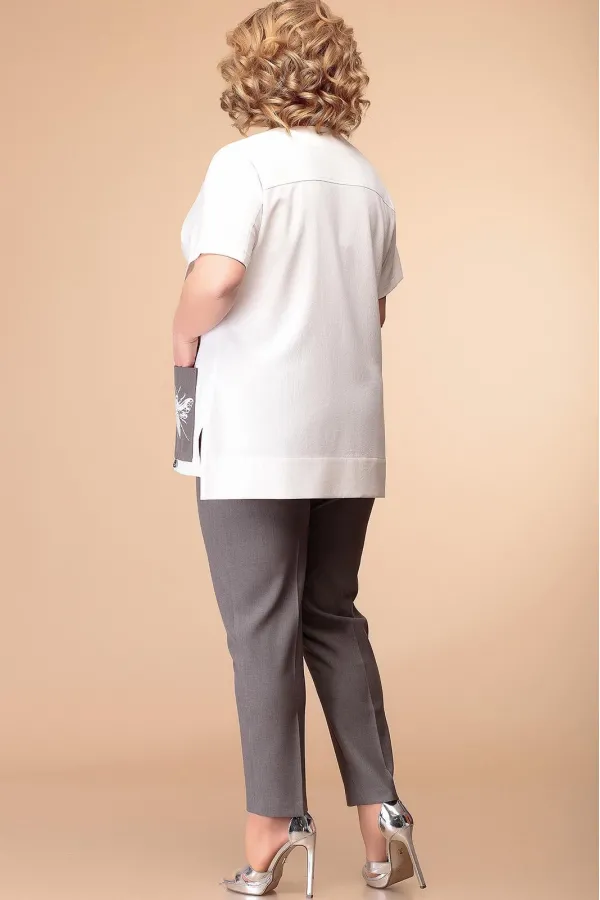 Костюм женский предназначен для повседневной носки. Костюм женский двух предметный:блузка и брюки. Блузка женская прямого силуэта, длиной ниже линии бедер на 10см, с фигурным низом. Перед с накладным прямоугольным карманом на левой части переда. Карман декорирован вышивкой, отделочной тесьмой и закреплен двумя пробивными металлическими хольнитенами. Спинка с отрезной кокеткой. Горловина круглая, обтачная, без воротника. Застежка центральная, бортовая, на шесть проибвных металлических кнопок. Боковые швы блузки с разрезами. Рукав короткий, цельнокроенный. Блузка без плечевых накладок. Брюки женские, заужены к низу, укороченные. Передние и задние половинки с талиевыми вытачками. Верхний срез с притачным поясом, собранным на эластичную тесьму между вытачками задних половинок и боковыми швами. Застежка на тесьму-молнию и одну обметанную петлю и одну пришивную пуговицу на поясе. Длина спинки 73см. Длина рукава 37см. Длина брюк 97см.