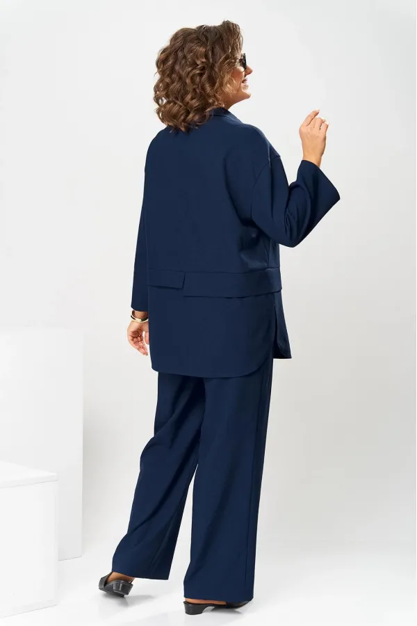 Костюм женский, предназначен для повседневной носки. Костюм женский 2-х предметный блузон и брюки. Блузон женский прямого силуэта, длиной ниже линии бёдер на 9 см. Блузон отрезной по линии талии. Верхняя часть переда с 2-мя нагрудными выточками, с 2-мя втачными планками, с 1-ним накладным прямоугольным карманом с клапаном на левой части переда на уровне линии груди. Карман декорирован аппликациями, клапан декорирован 2-мя пробивными металлическими блочками и декоративной цепочкой. Верхняя часть спинки цельнокроеная. Нижняя часть переда и нижняя часть спинки выполнены из отделочной ткани. Нижняя часть переда с 2-мя цельнокроеными планками с застёжкой на 3-и вертикально обмётанных петли и 2-и пришивные пуговицы. Боковые швы блузона с разрезами, с закруглёнными концами. Низ блузона обтачной. Шов соединения верхней и нижней частей блузона с притачными разноуровневыми планками с обтачными разрезами по центру переда и центру спинки. Горловина круглая с втачным воротником рубашечного типа с отрезной стойкой. Застёжка центральная на планках переда на 4-и обмётанные петли и 4-и пришивных пуговицы. Рукав втачной, одно шовный длиной 7/8. Блузон со спущенным плечом, без плечевых накладок. Брюки женские прямые, длинные. Передние половинки с карманами в боковых швах. Задние половинки с таллиевыми вытачками. Брюки с притачным поясом, собранным на эластичную тесьму. Длина брюк по боковому срезу 101 см. Длина спинки блузон в 78 см, длина рукава 45 см.