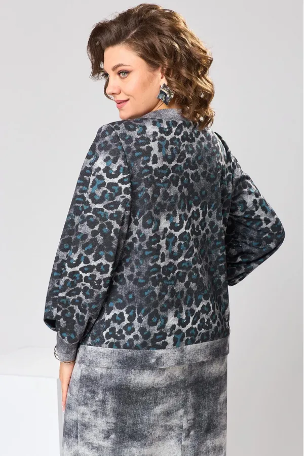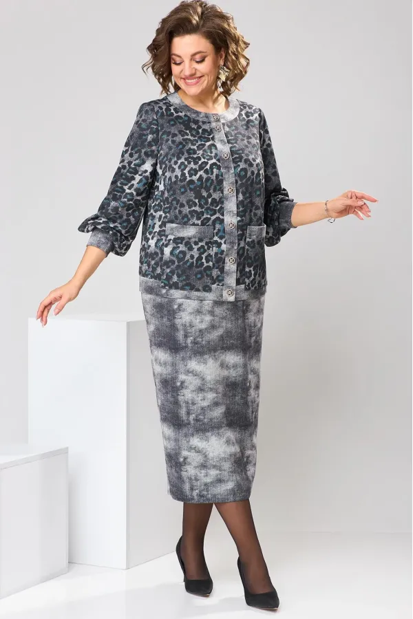 Костюм женский, предназначен для повседневной носки. Костюм женский 2-х предметный жакет и юбка. Жакет прямого силуэта, длиной до линии бёдер. Перед с 2-мя нагрудными вытачками, с 2-мя накладными прямоугольными карманами с притачной обточкой из отделочной ткани вверху; с приточными планками по горловине и краю борта из отделочной ткани. Спинка цельнокроеная. Жакет с притачной планкой по низу из отделочной ткани. Горловина круглая обточная, без воротника. Застёжка центральная, бортовая на 7-мь обмётанных петель и 7-мь пришивных пуговиц. Рукав втачной, одно шовный, длинный, внизу со встречной складкой и лёгкой сборкой, с притачной манжетой из отделочной ткани. Перед и спинка жакета на подкладке. Жакет с плечевыми накладками. Юбка женская карандаш, длиной до нижней части икры. Переднее полотнище цельнокроеное. Заднее полотнище с 2-мя таллиевыми вытачками и средним швом, заканчивающимся разрезом. Юбка с притачным поясом, собранным на эластичную тесьму. Юбка на подкладке. Длина спинки жакета 62 см, длина рукава 61,5 см. Длина юбки по боковому срезу 83 см.