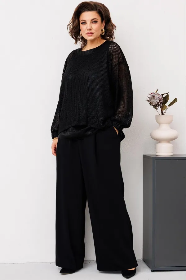 Комплект женский относится к торжественной одежде. Комплект женский 3-х предметный джемпер, топ и брюки. Джемпер прямого силуэта, с фигурным низом. Перед и спинка цельнокроеные, с притачной планкой из отделочной ткани по горловине. Джемпер со спущенным плечом. Рукав втачной, одно шовный, длинный, с притачной манжетой, собранной на эластичную тесьму. Джемпер без плечевых накладок. Топ женский прямого силуэта, длиной до линии бёдер. Перед с 2-мя нагрудными вытачками. Спинка цельнокроеная. Горловина круглая, без воротника. Проймы обтачные. Топ на подкладке. Брюки женские прямые широкие, длинные. Передние половинки с односторонними складками и карманами в боковых швах. Задние половинки с таллиевыми вытачками. Брюки с притачным поясом, собранным на эластичную тесьму, закреплённую 2-мя отделочными строчками.