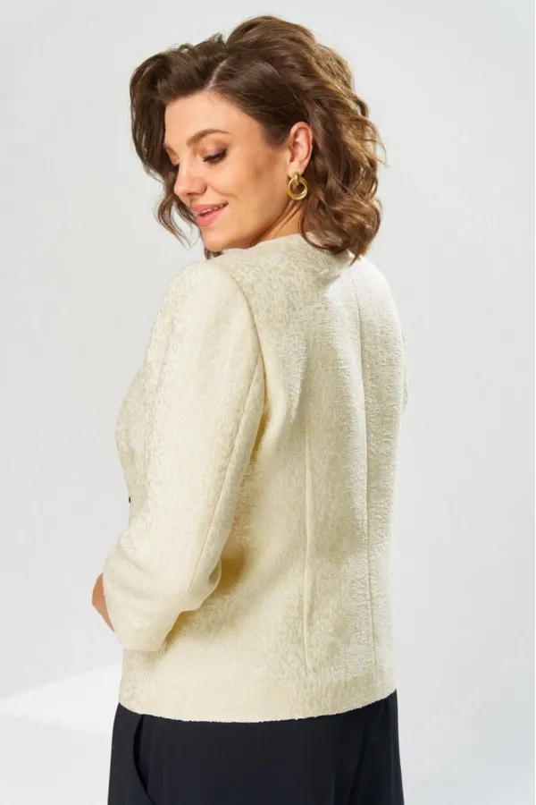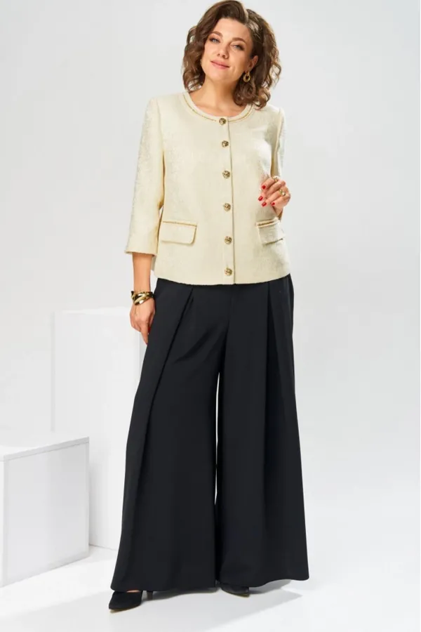 Костюм женский относится к нарядной торжественной одежде. Костюм женский 2-х предметный жакет и брюки. Жакет женский полуприлегающего силуэта, длиной до линии бёдер. Перед с 2-мя нагрудными вытачками с притачными планками по горловине, декорированными надстрочной отделочной тесьмой, с 2-мя надстрочными вертикальными планками, с 2-мя прорезными карманами с клапаном с закруглёнными концами и листочкой, клапан декорирован надстрочной отделочной тесьмой, карманы расположены ниже линии талии на 2 см. Спинка с 2-мя таллиевыми вытачками и средним швом. Горловина круглая, обточная, без воротника. Застёжка центральная бортовая на 6-ть вертикально обмётанных петель и 6-ть пришивных пуговиц. Рукав 2-х шовный втачной, длиной 3/4. Жакет на притачной подкладке. Брюки женские, широкие, длинные. Передние половинки со встречными складками с карманами в боковых швах. Задние половинки без конструктивных особенностей. Брюки с притачным поясом, собранным на эластичную тесьму, закреплённую 2-мя отделочными строчками. Длина спинки жакета 58 см, длина рукава 48 см. Длина брюк по боковому срезу 99 см.