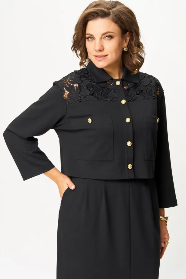 Жакет прямого кроя с застежкой на петли и пуговицы, с втачным рукавом. Линия плеча спущена, по горловине отложной воротник. По переду накладные карманы. Кокетка из кружева по переду и спинке добавляет романтичности и легкости.
