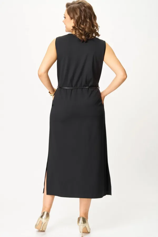 Платье полуприлегающего силуэта, без рукава. Перед платья с горизонтальным швом по талии. Верхняя часть с вытачками по линии груди, нижняя часть со складками в области талии и карманами, что обеспечивает прекрасную посадку и подчеркивает фигуру. Высокие разрезы по бокам и переду платья добавляют удобства. В комплекте съемный ремень.