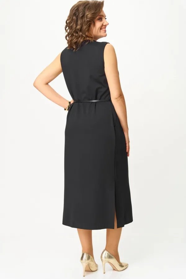 Платье полуприлегающего силуэта. Перед платья с горизонтальным эластичным швом по талии. Верхняя часть с вытачками по линии груди, нижняя часть со складками в области талии и карманами что обеспечивает прекрасную посадку и подчеркивает фигуру. Высокие разрезы по бокам и переду платья добавляют удобства. В комплекте съемный ремень.