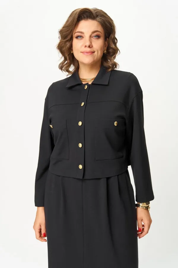 Жакет прямого кроя с застежкой на петли и пуговицы, с длинным втачным рукавом. Линия плеча спущена, по горловине отложной воротник. Перед с кокеткой, накладными карманами. Спинка цельнокроеная с кокеткой.